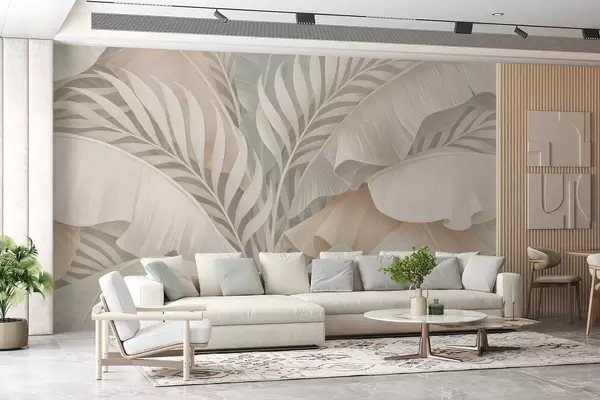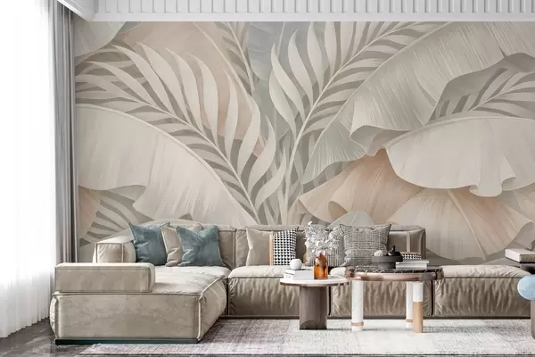 Fototapeter store tropiske blader i farger av fersken og matt turkis Nr. w05062
