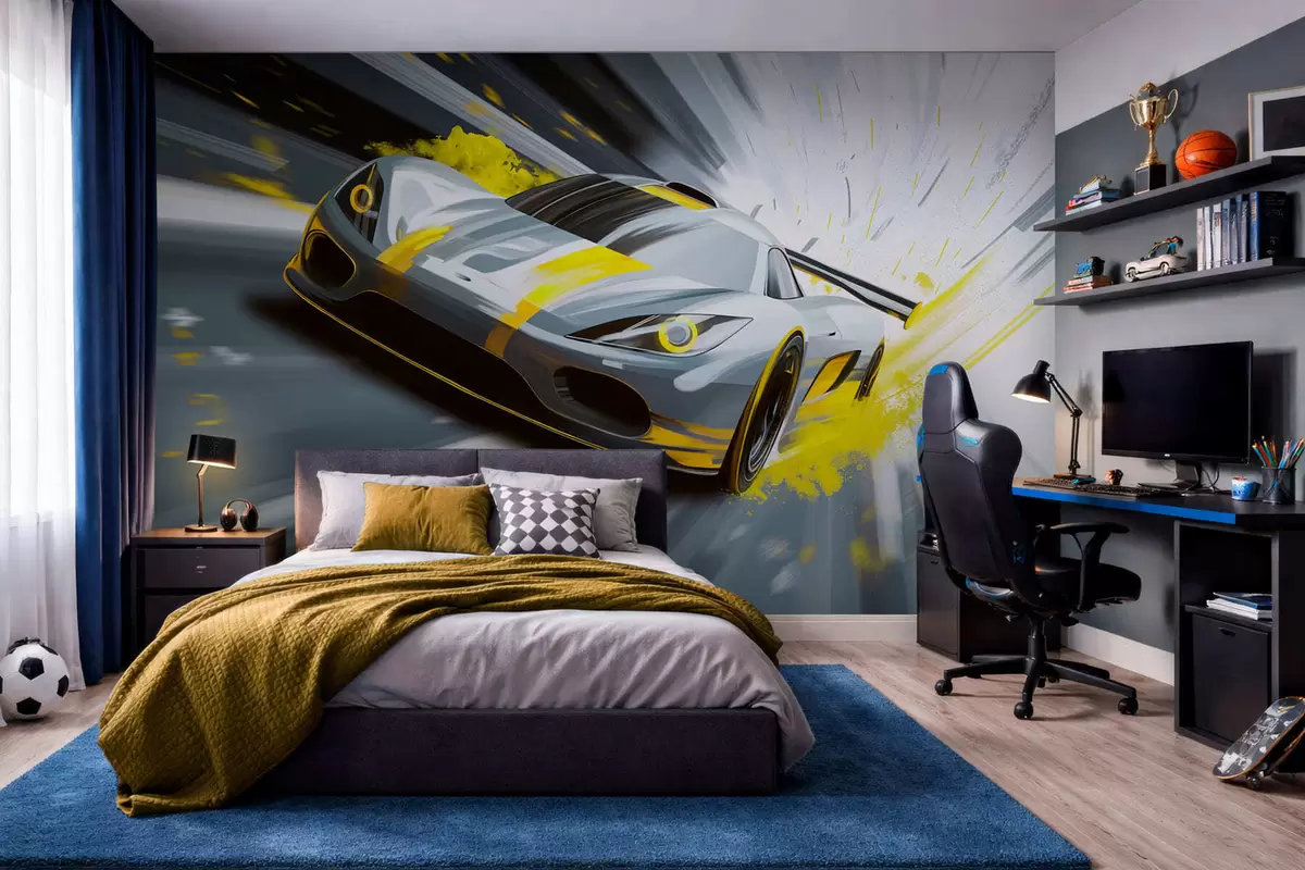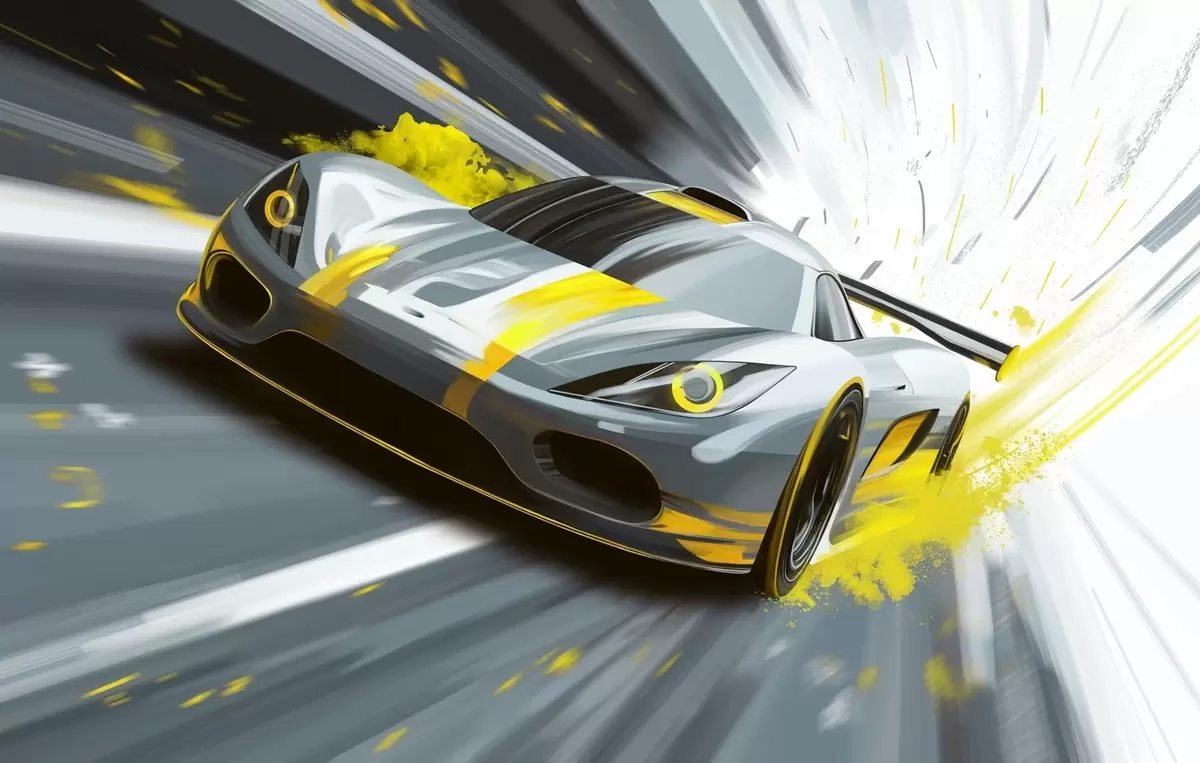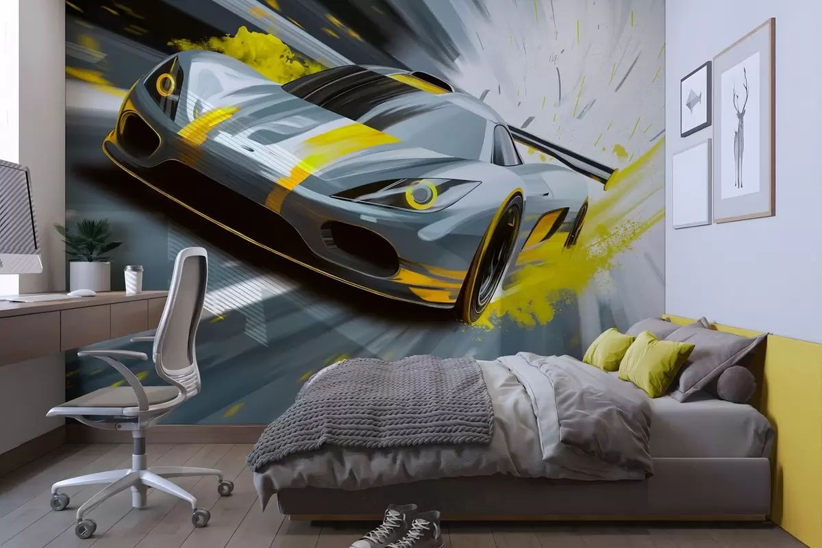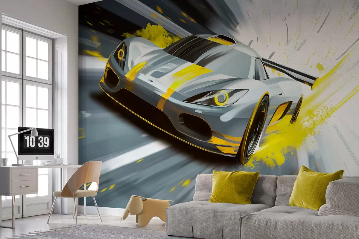 Fototapeter Dynamisk sportsbil i digital tegningsstil med gule detaljer Nr. w05069v2