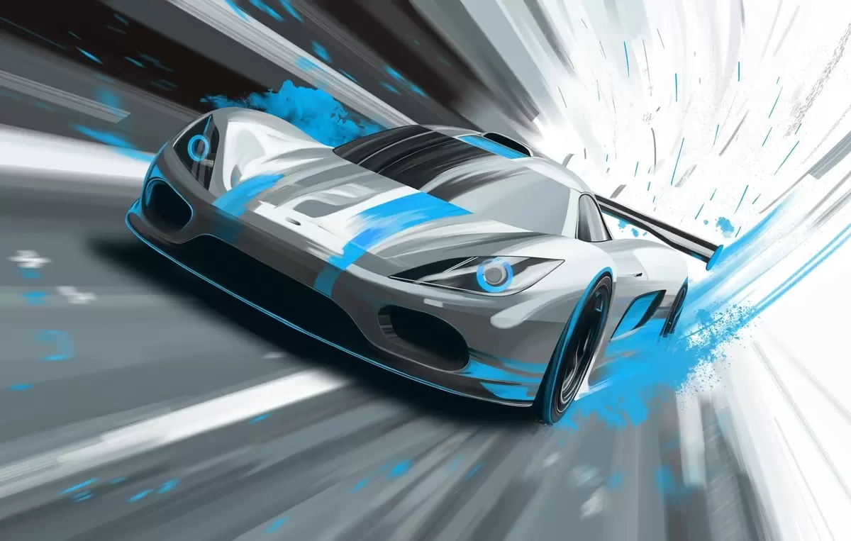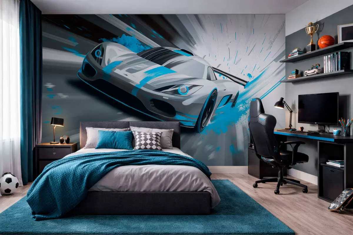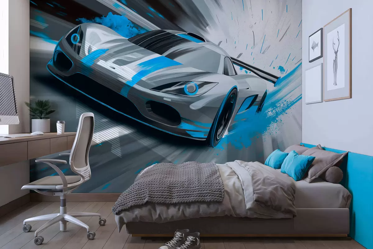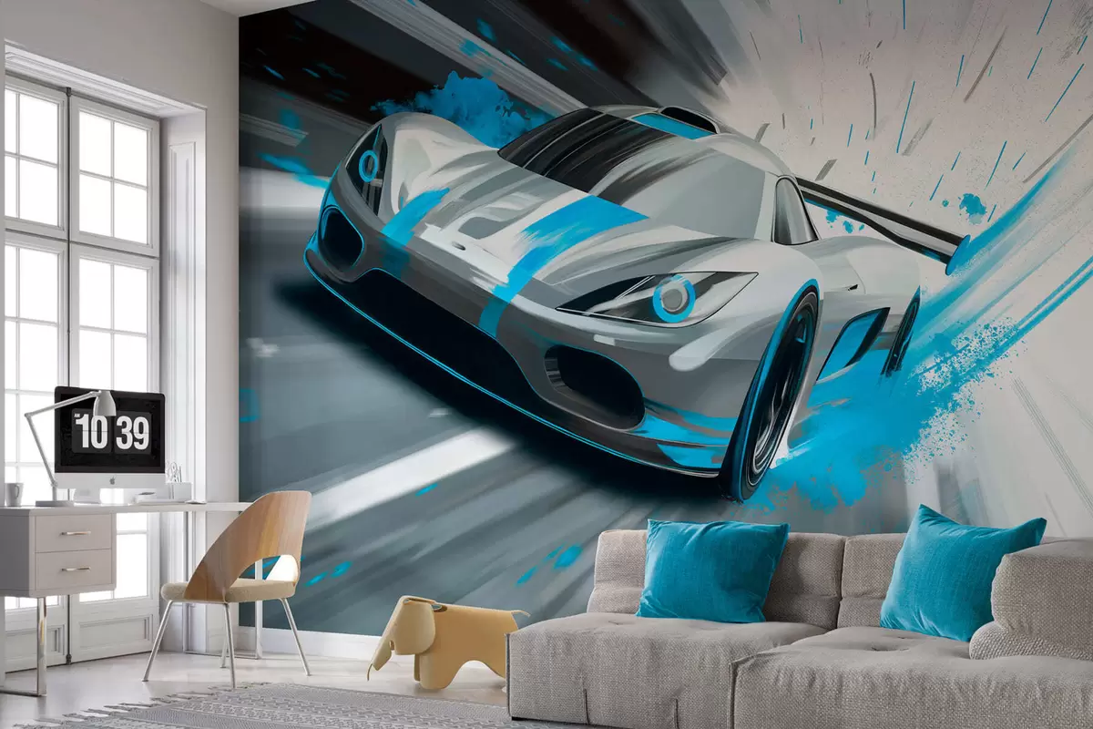 Fototapeter Dynamisk sportsbil i digital tegningsstil med turkise detaljer Nr. w05069v3