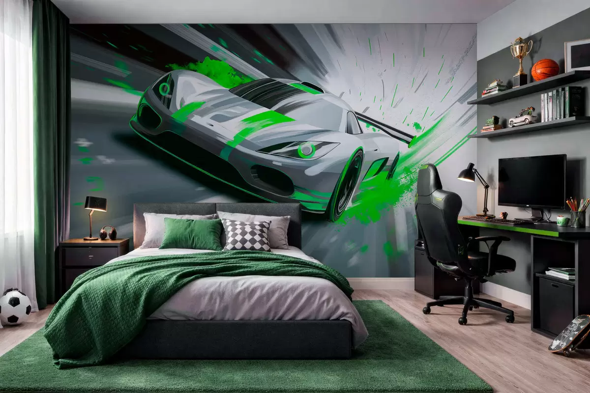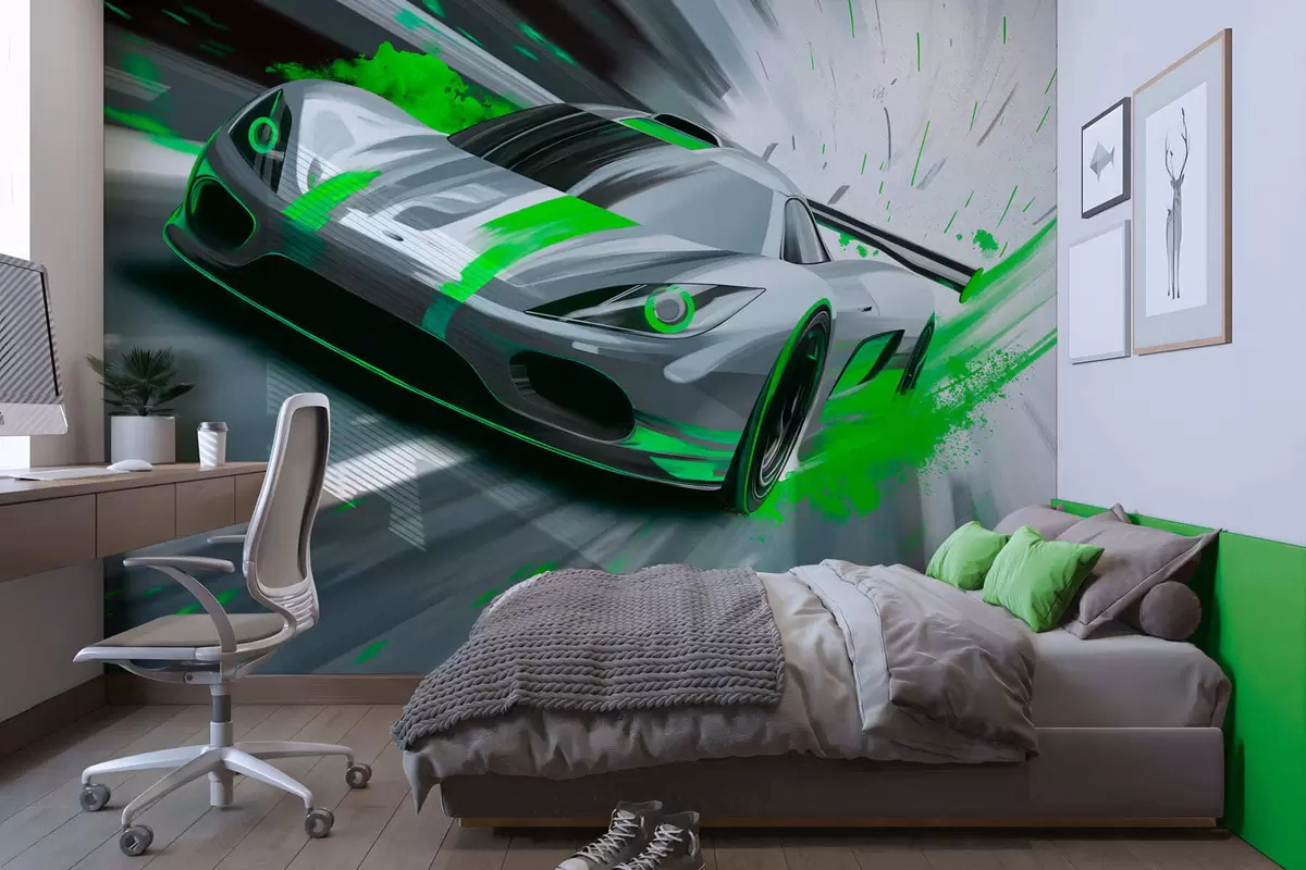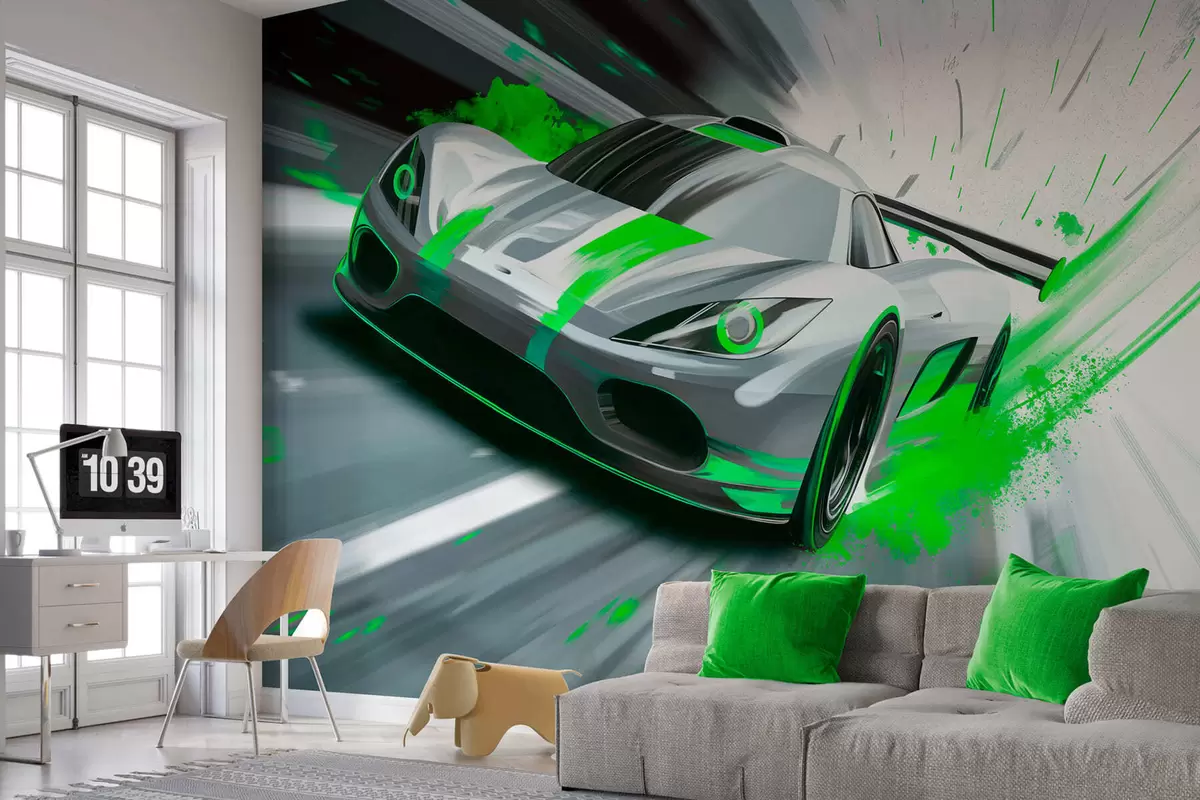Fototapeter Dynamisk sportsbil i digital tegningsstil med grønne detaljer Nr. w05069v4