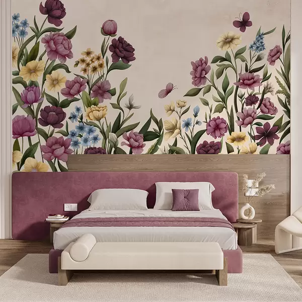 fototapeter Blomsterkomposisjon med planter og sommerfugler på lys bakgrunn w05072