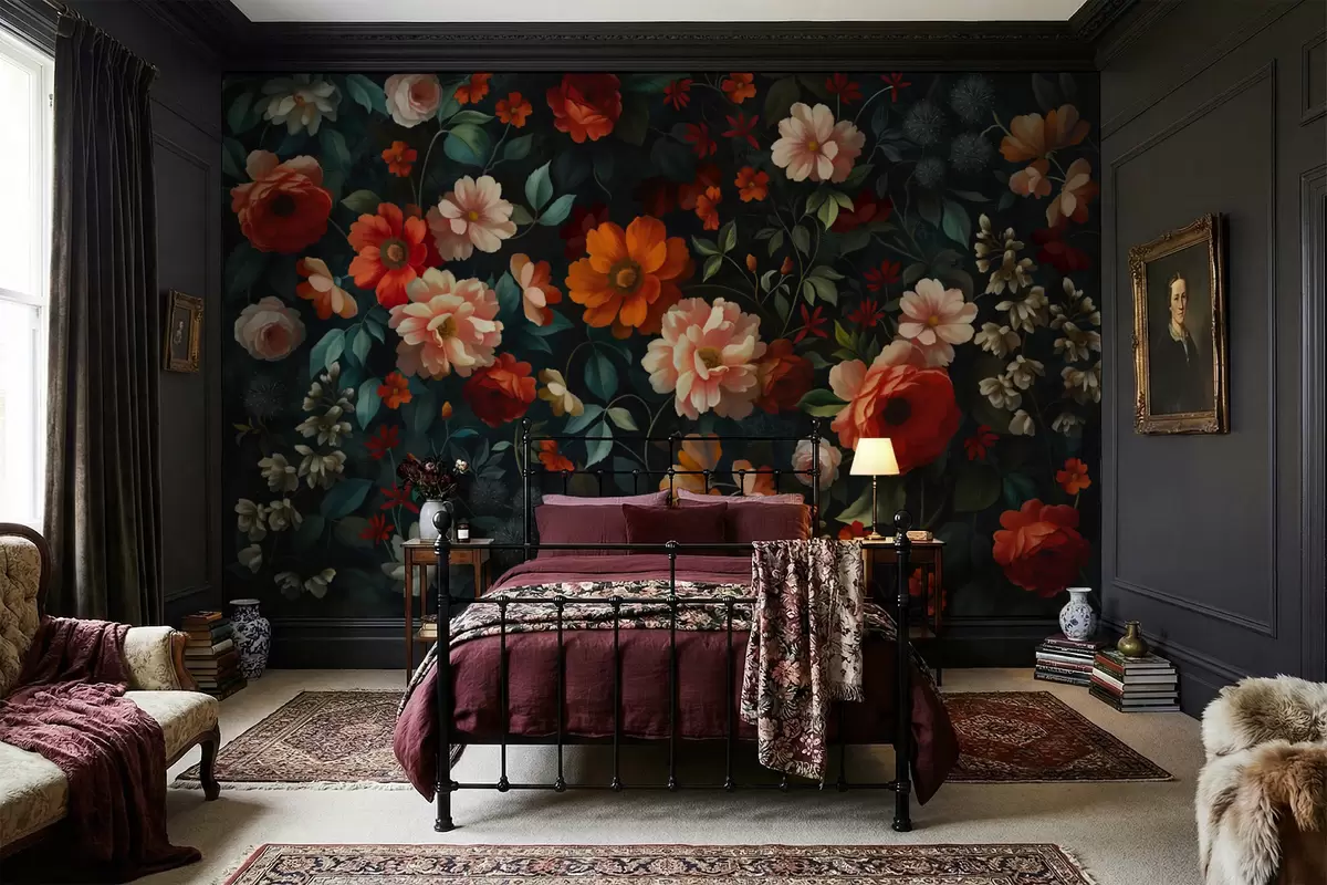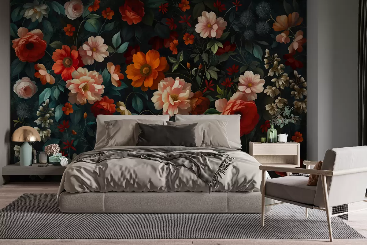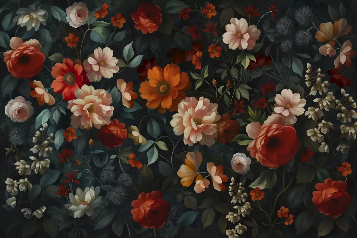 Fototapeter Mørkt blomstermønster med frodige hageblomster Nr. w05087
