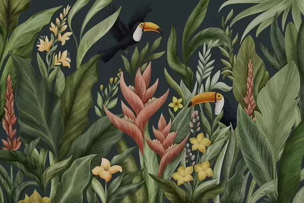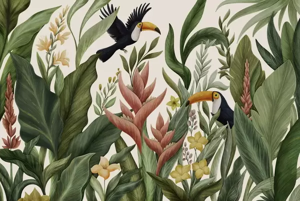 Fototapeter Tropiske planter og fugler med store nebb på lys bakgrunn Nr. w05088