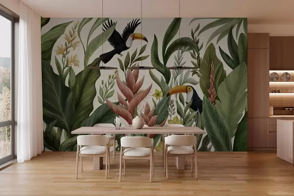 Fototapeter Tropiske planter og fugler med store nebb på lys bakgrunn Nr. w05088v1