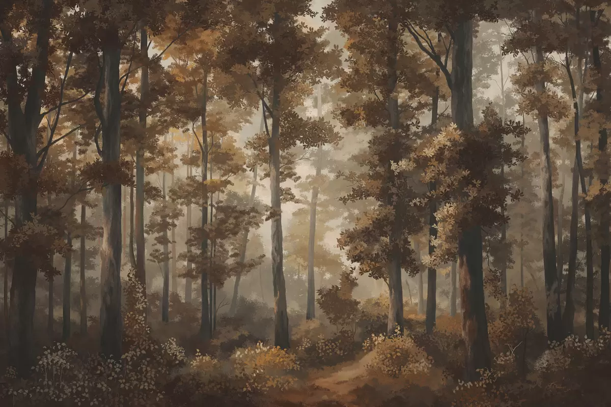 Fototapeter Høstlig skogscene med varmt lys og tette trær Nr. w05089v1
