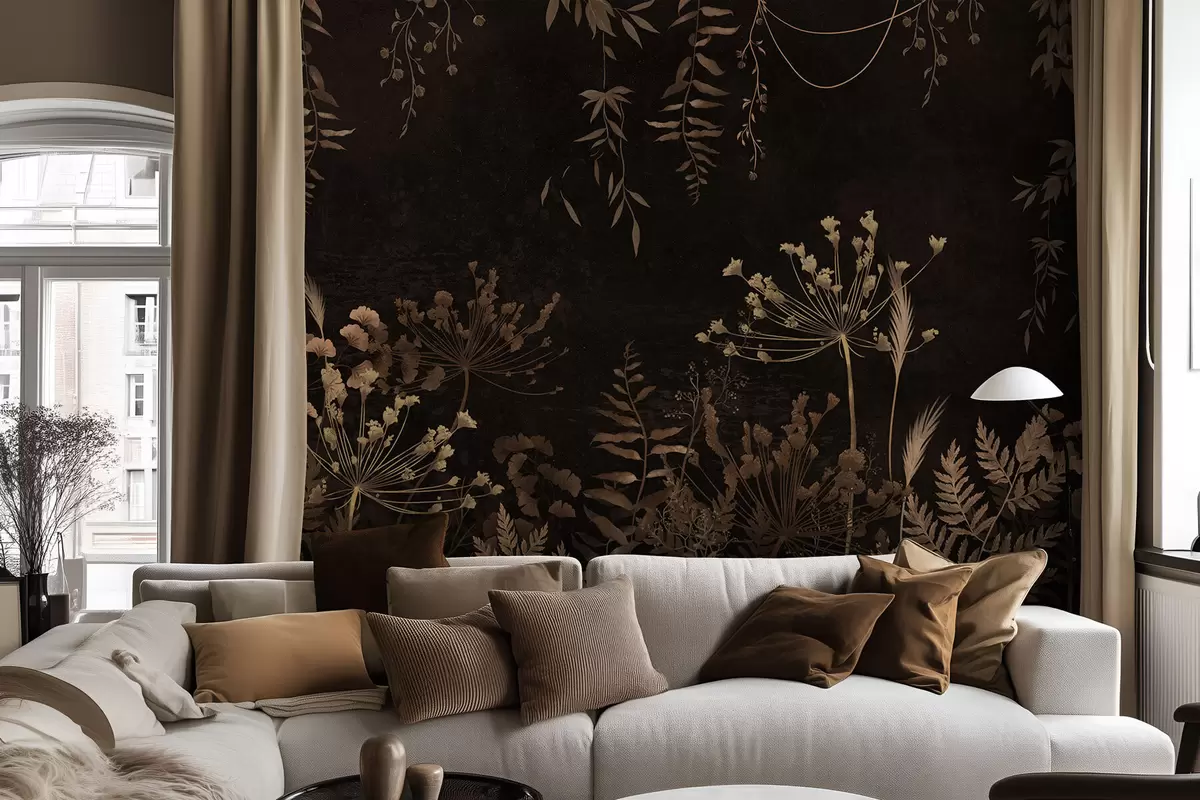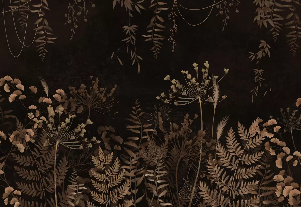Fototapeter Mørkt botanisk mønster med blomster og gress Nr. w05092v3