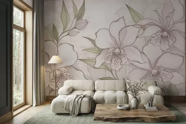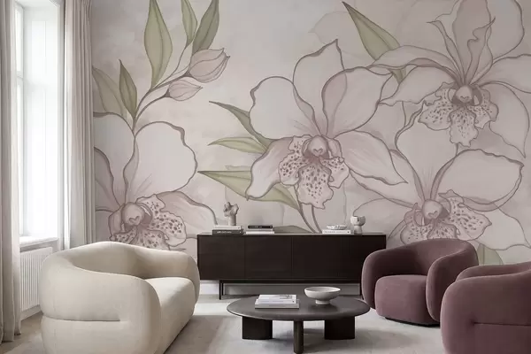 Fototapeter Illustrasjon av bleke orkideer med blader på beige bakgrunn Nr. w05117