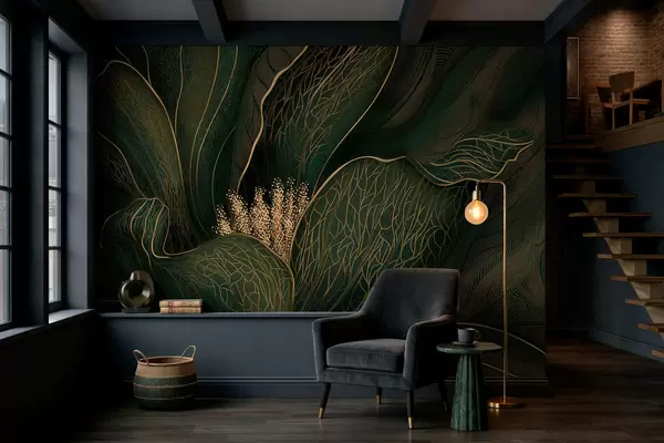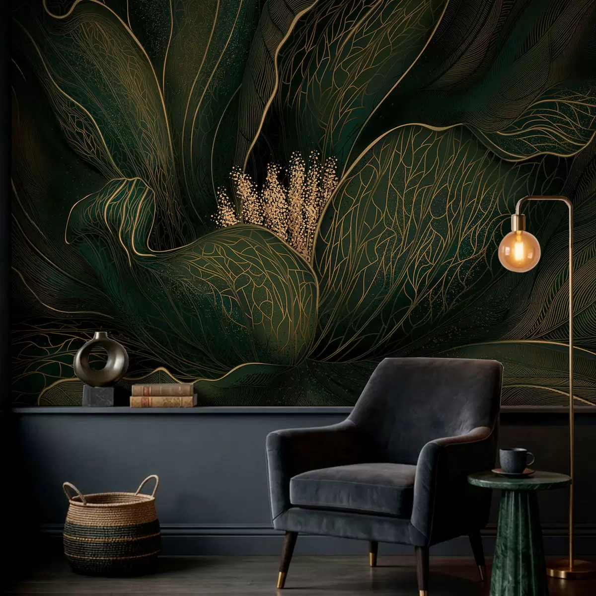 Fototapeter Mørkegrønn abstrakt blomst med fine linjedetaljer Nr. w05119v1