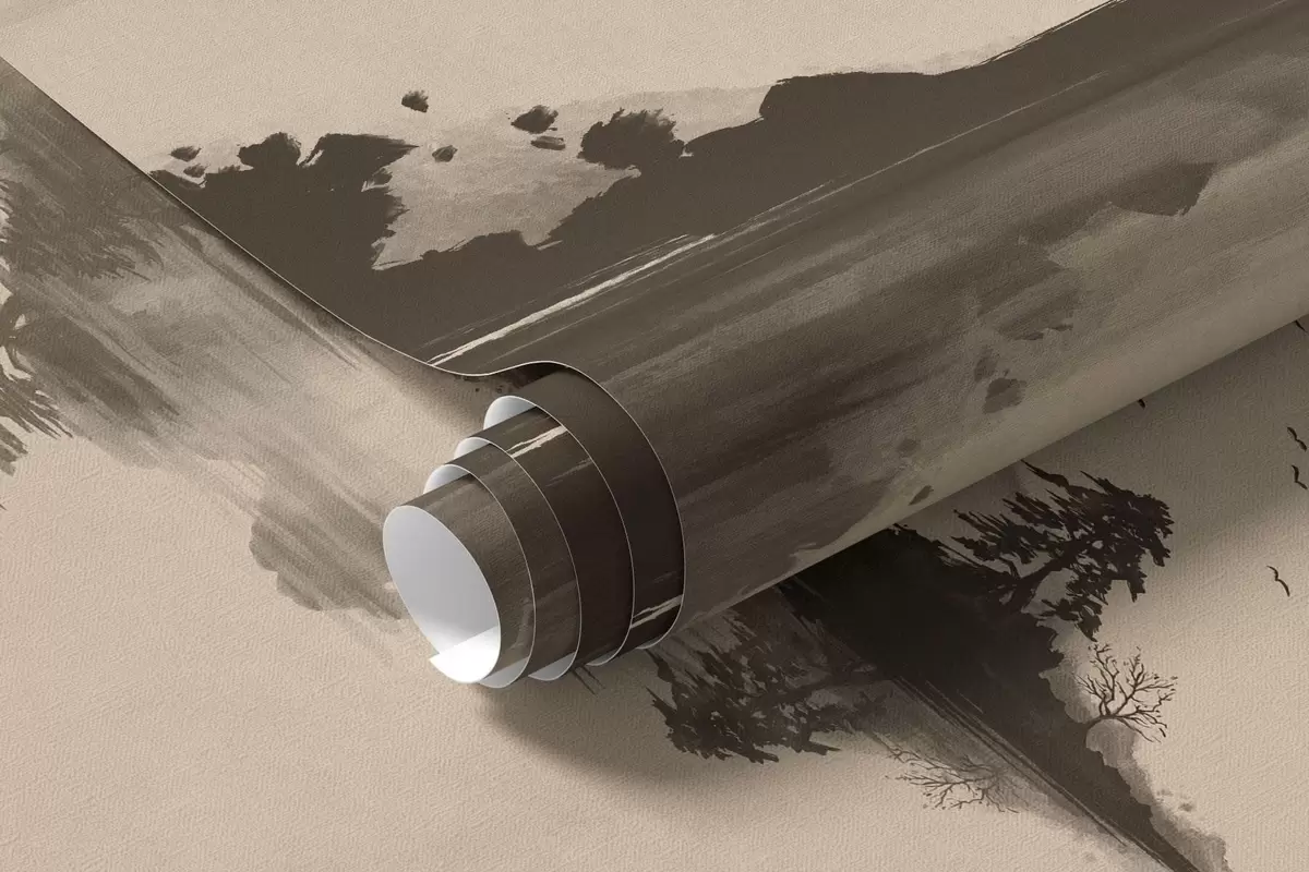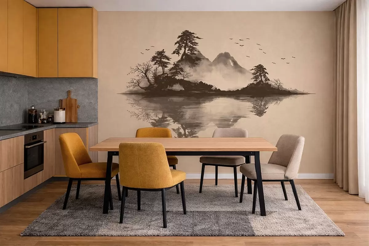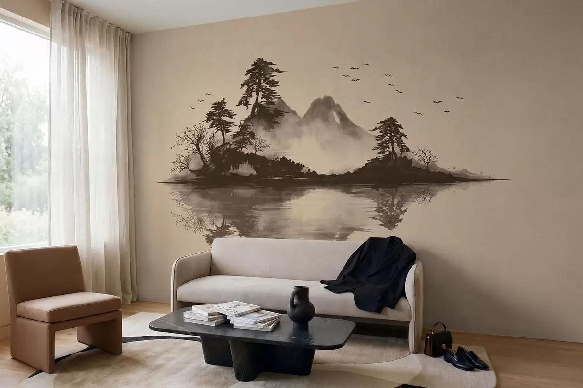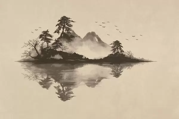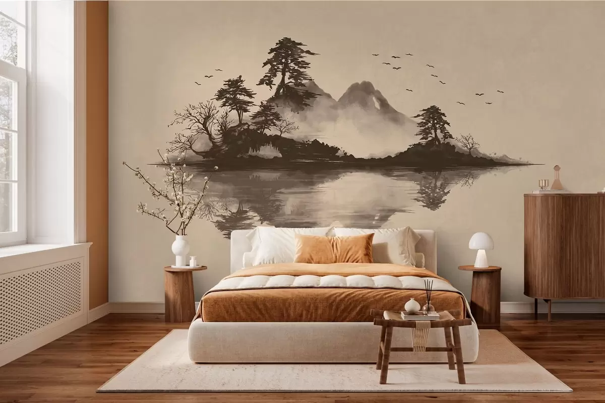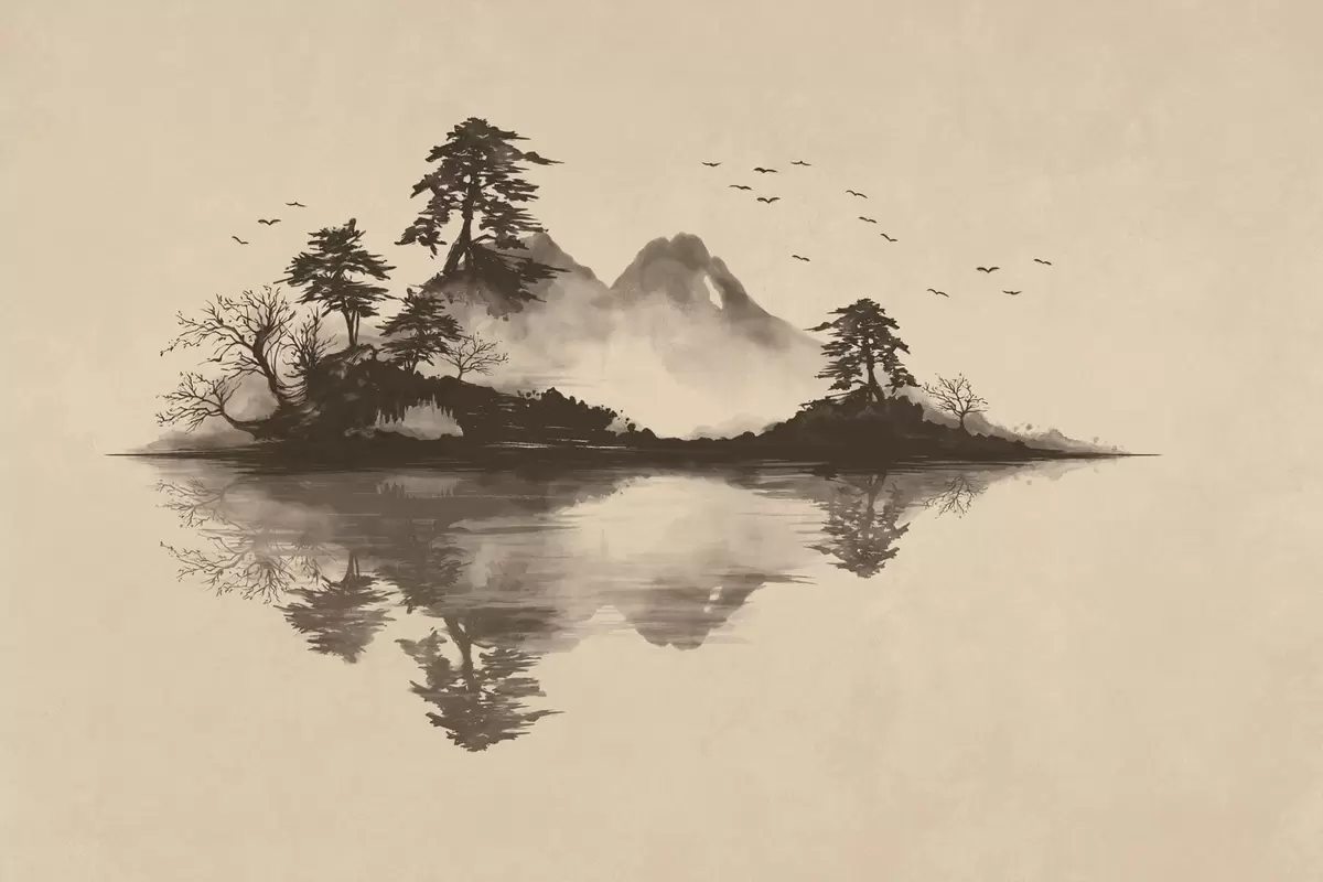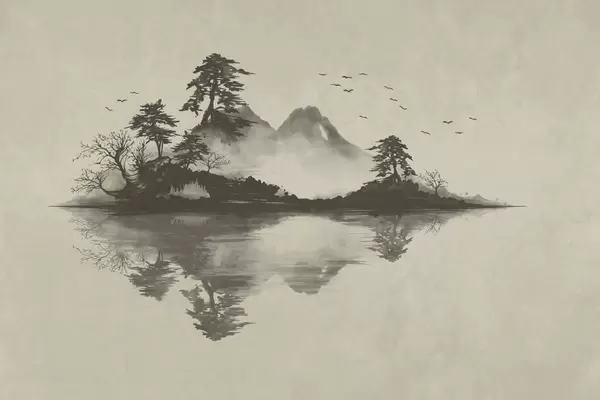 Fototapeter Sumi-e-fjellandskap med furutrær og speilbilde Nr. w05124