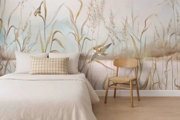 Fototapeter Illustrasjon av siv og fugler ved vannet i myke farger Nr. w05125