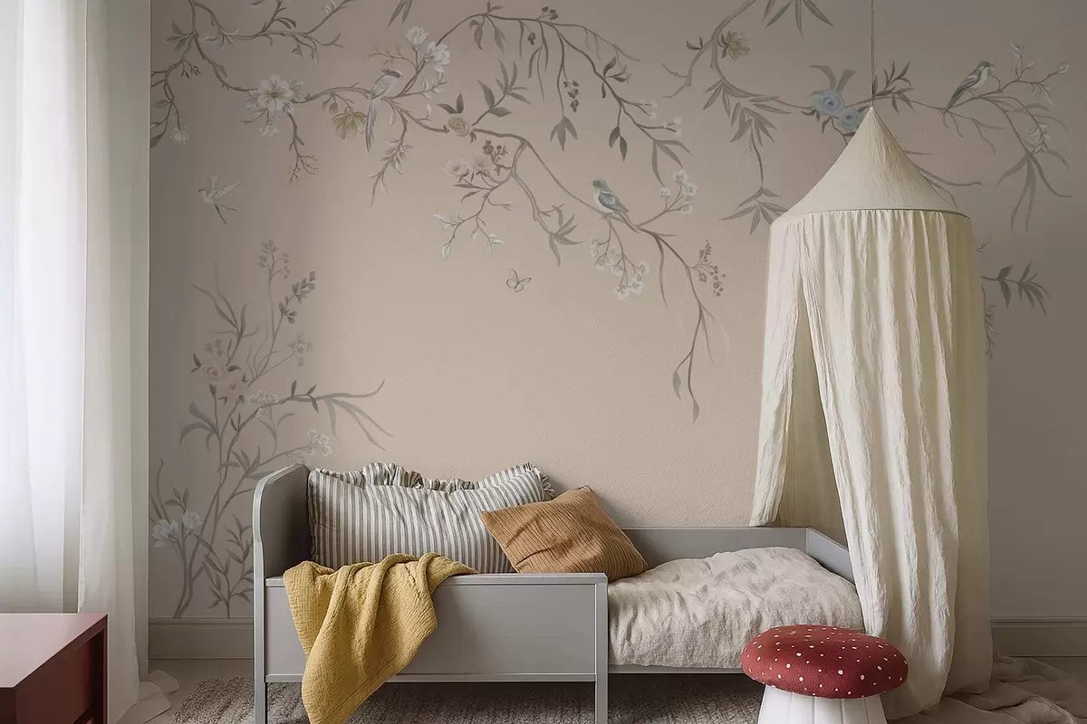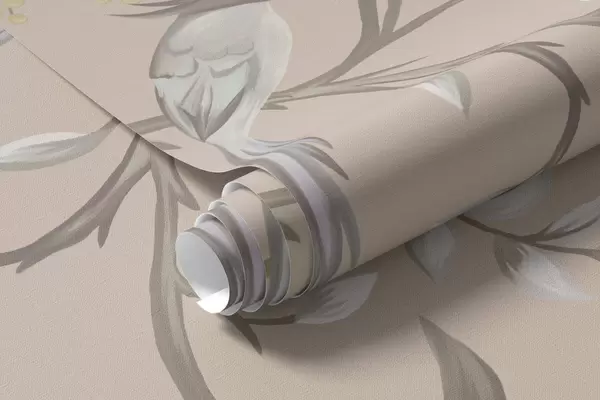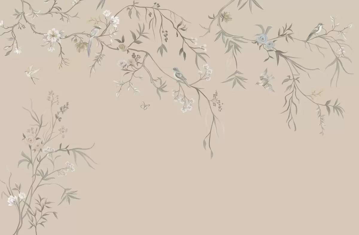 Fototapeter Blomstergrener med fugler på varm beige bakgrunn Nr. w05127v1