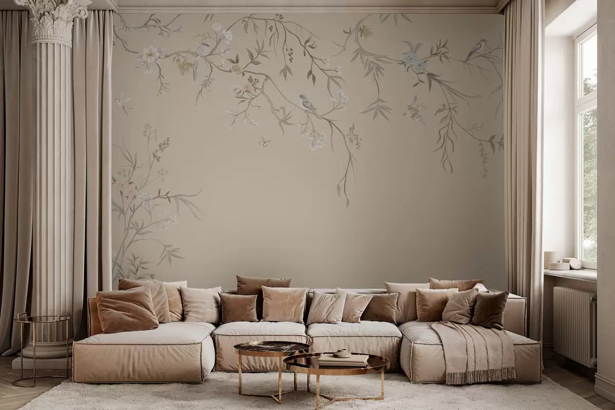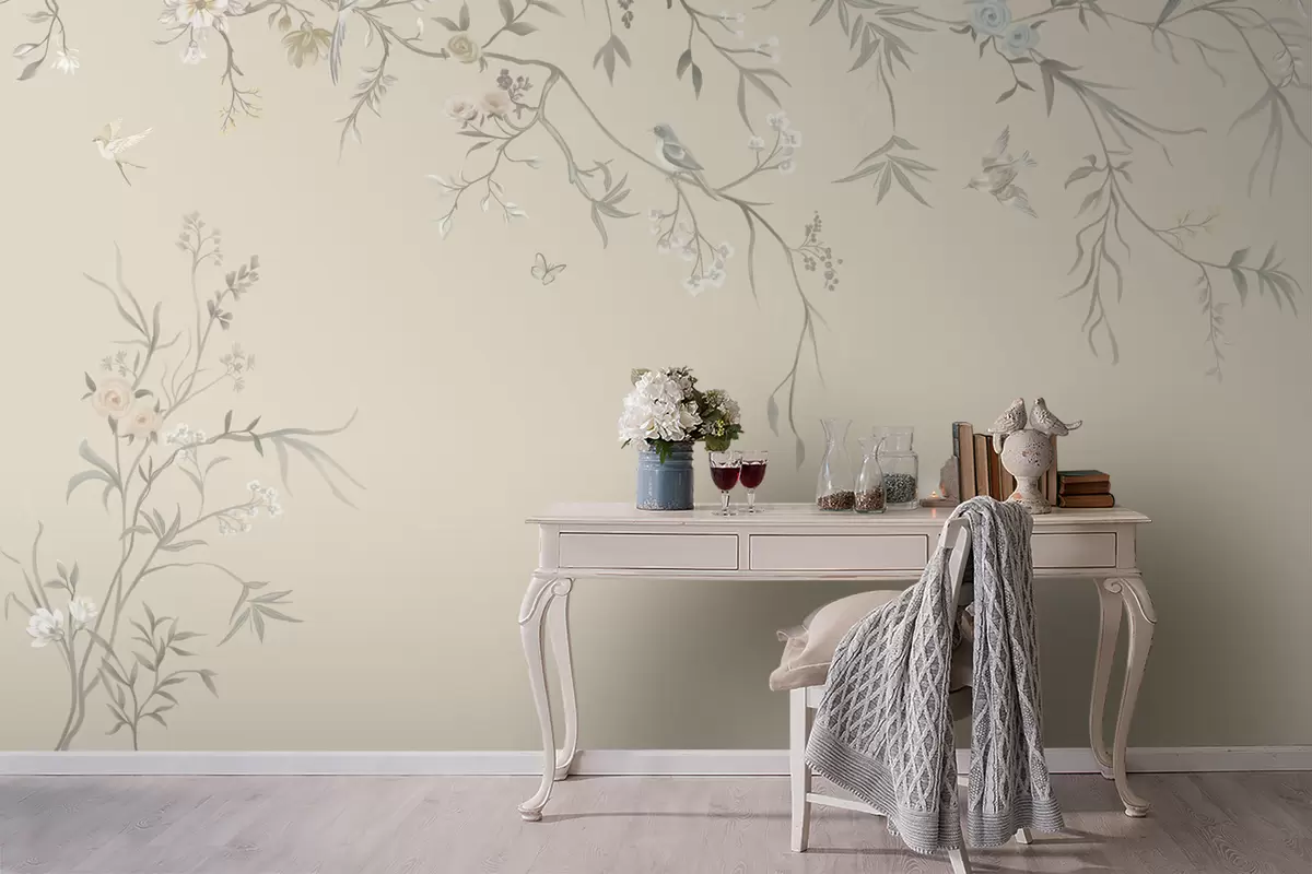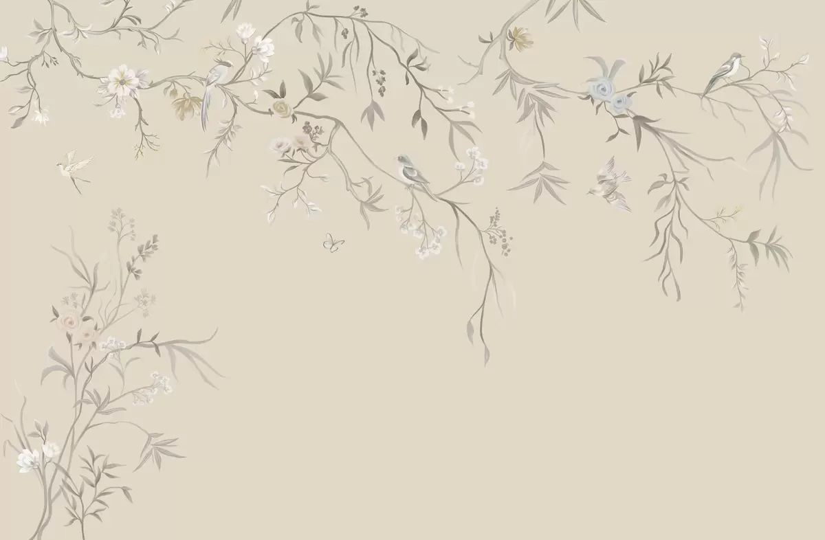Fototapeter Lyse blomster og fugler på pastellbakgrunn Nr. w05127v2