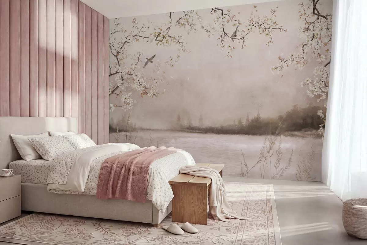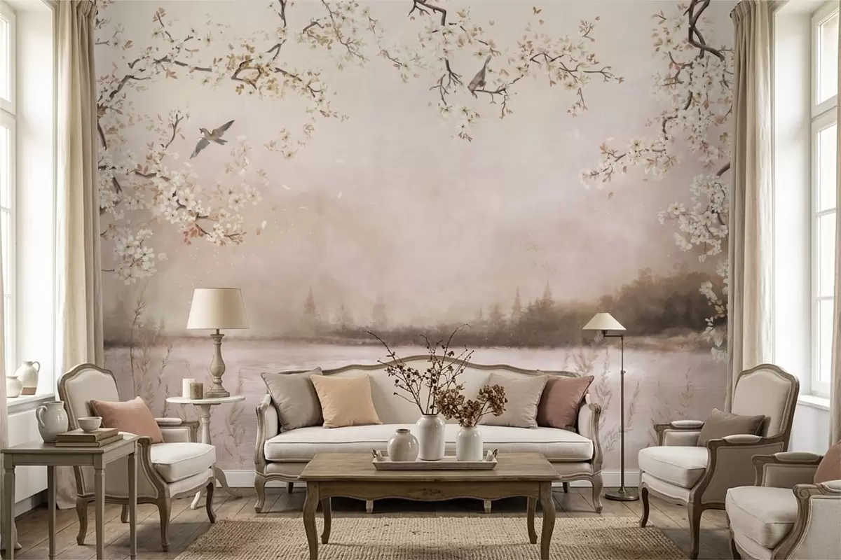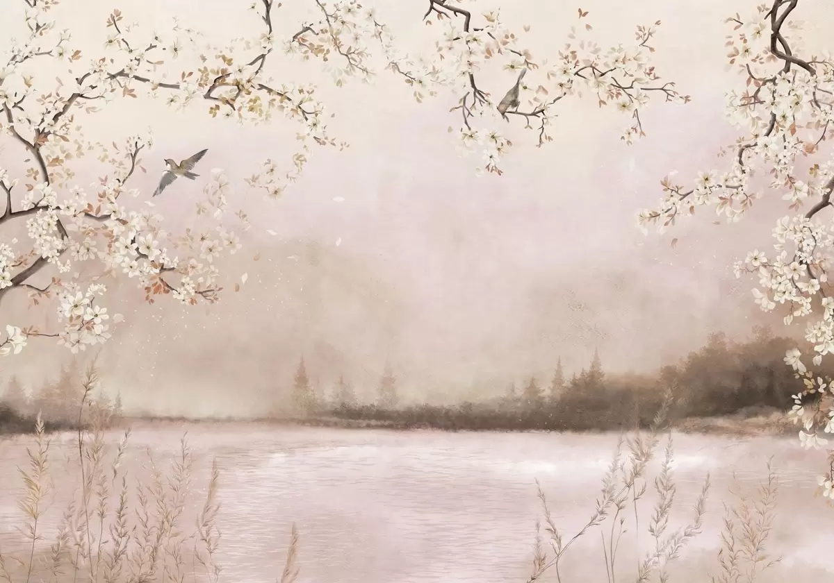 Fototapeter Blomstrende grener over rolig innsjø med fugler i tåke Nr. w05155v1