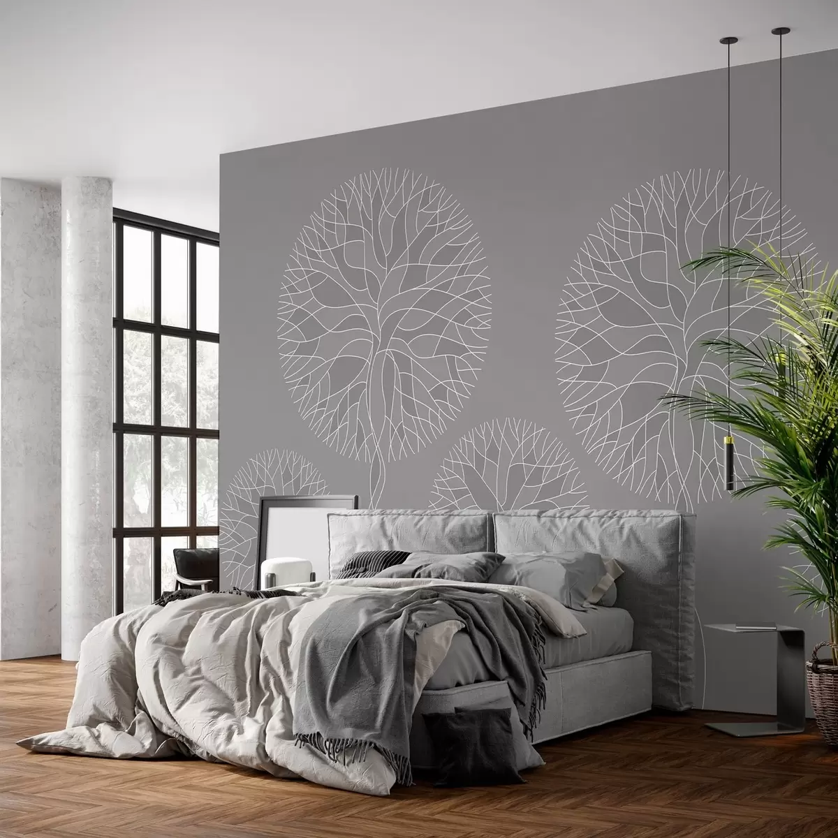 Fototapeter Fantasi-lineære trær med frodige kroner i mellomgrå toner Nr. w05213v5