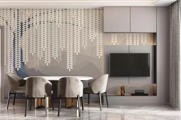 Fototapeter Stilisert piletre med hengende blader mot en bakgrunn av minimalistiske fjell i nyanser av beige og blågrønt. Nr. w05232