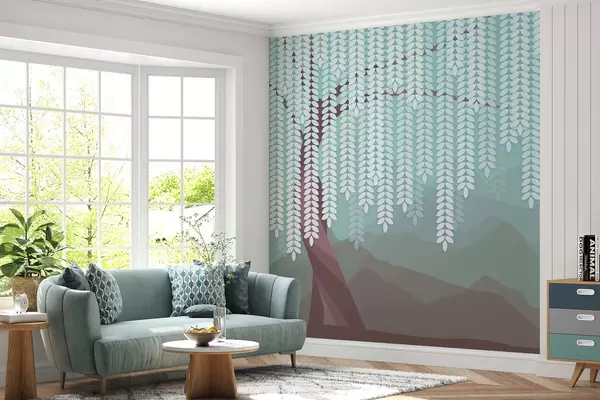 fototapeter Stilisert piletre med hengende blader mot en bakgrunn av minimalistiske fjell i nyanser av sjokolade og turkis. w05232v1