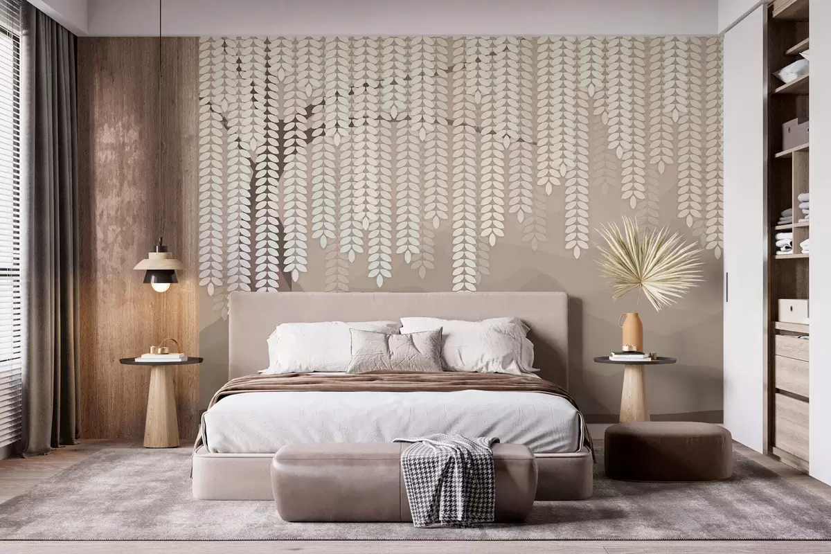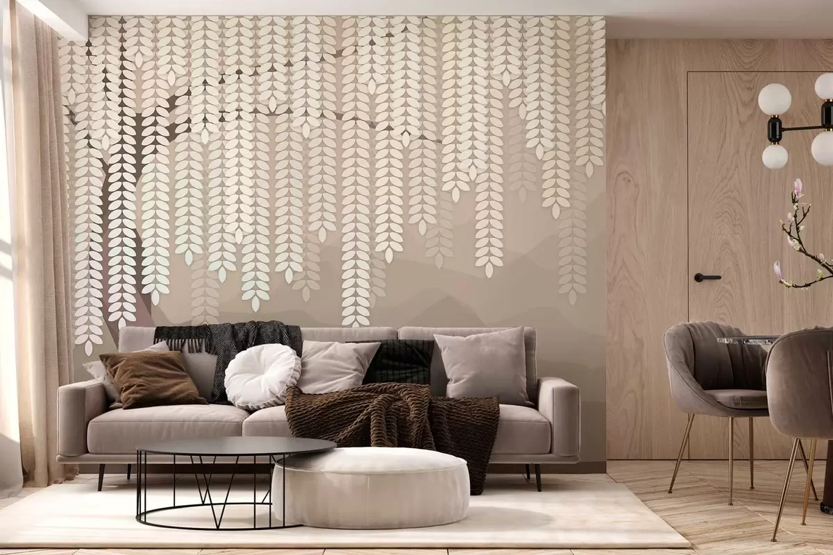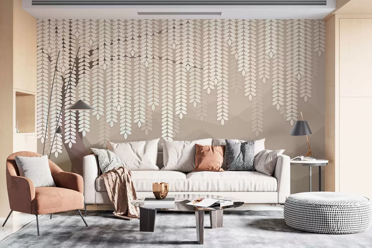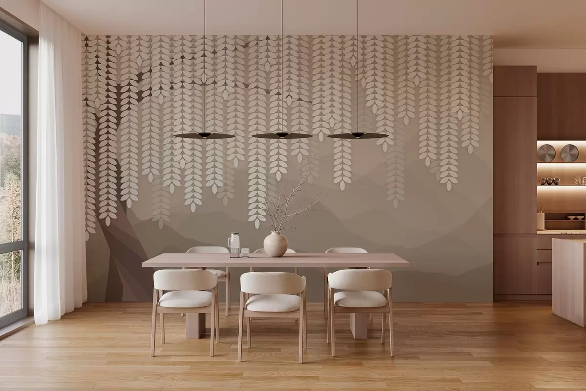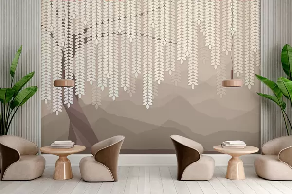 Fototapeter Stilisert piletre med hengende blader mot en bakgrunn av minimalistiske fjell i kaffefarger. Nr. w05232v2