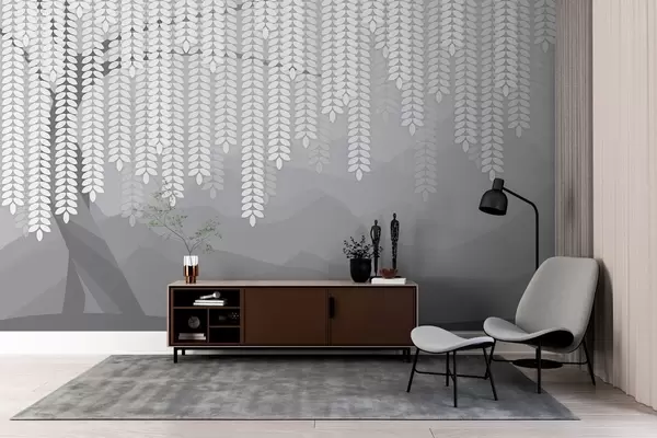 Fototapeter Stilisert piletre med hengende blader mot en bakgrunn av minimalistiske fjell i gråtoner. Nr. w05232v3