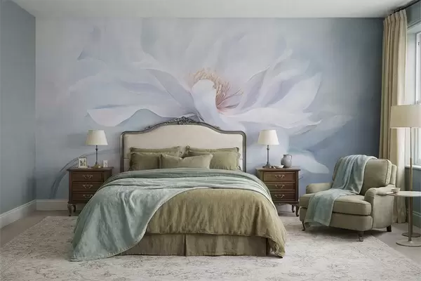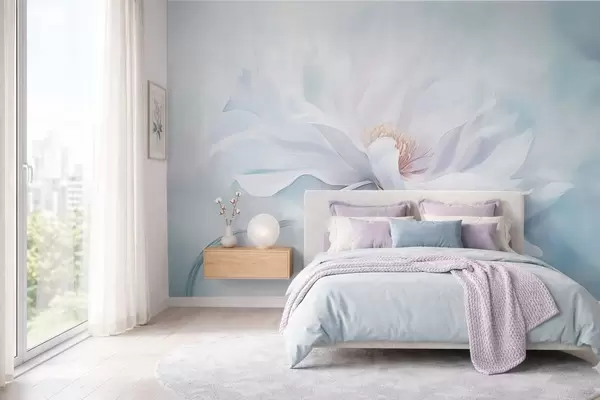 Fototapeter Myk hvit blomst med flytende kronblader på blå bakgrunn Nr. w05354