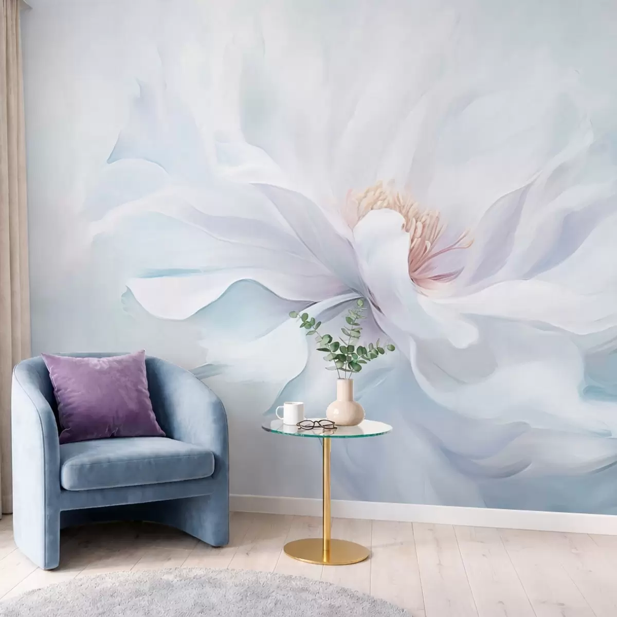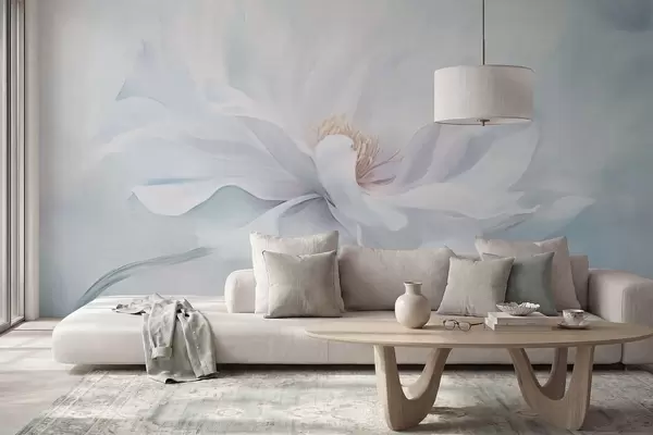 Fototapeter Myk hvit blomst med flytende kronblader på blå bakgrunn Nr. w05354