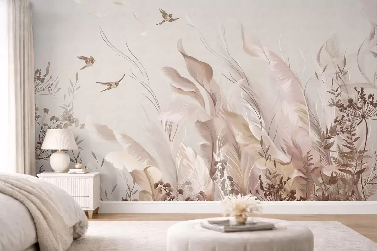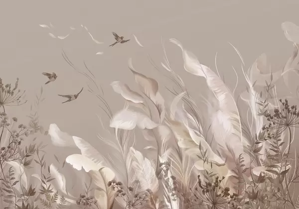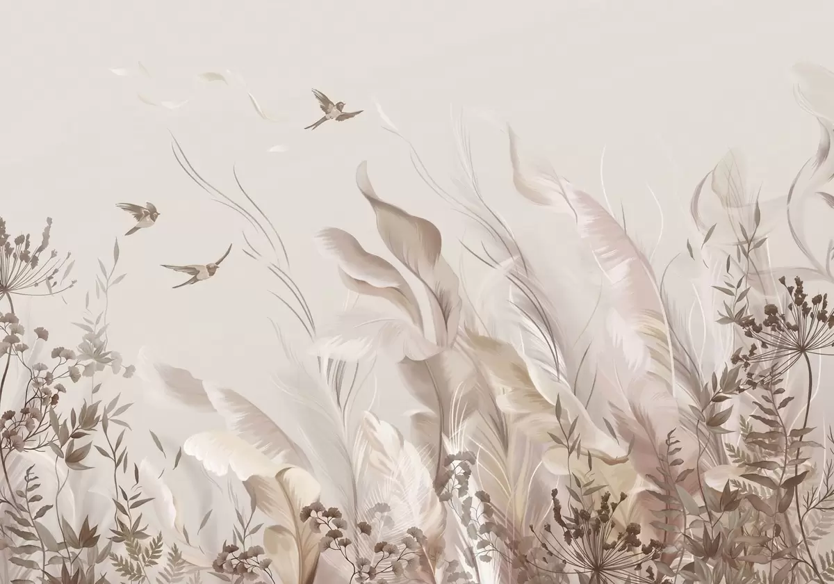 Fototapeter Myke fjær, gress og fugler i lyse farger Nr. w05395