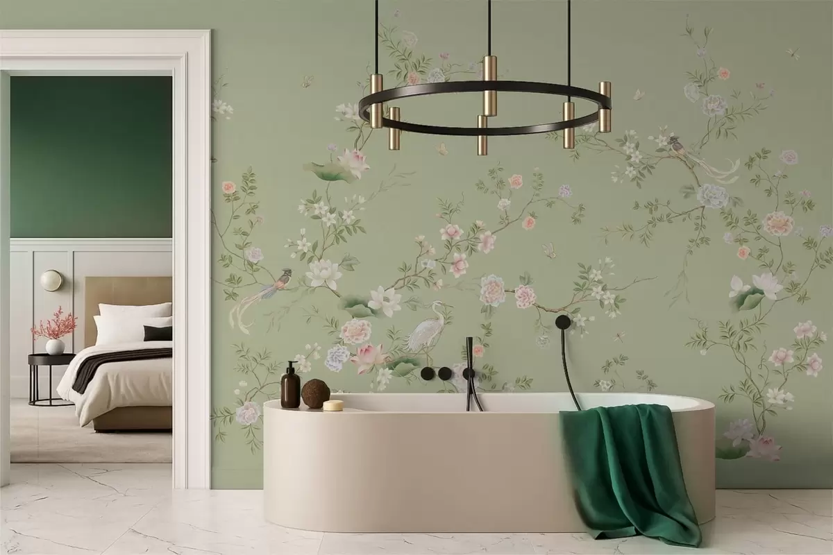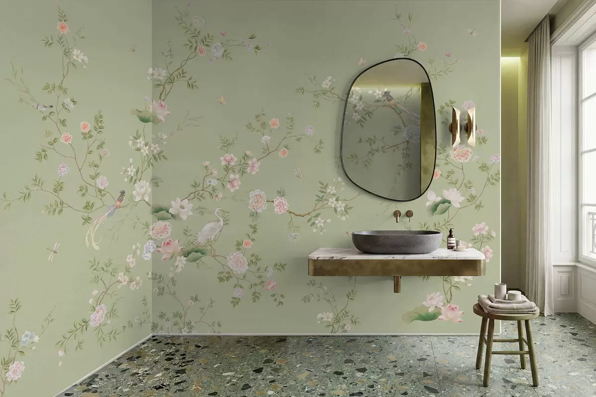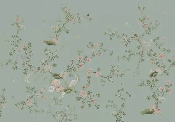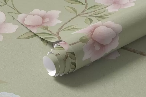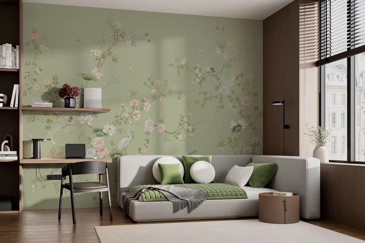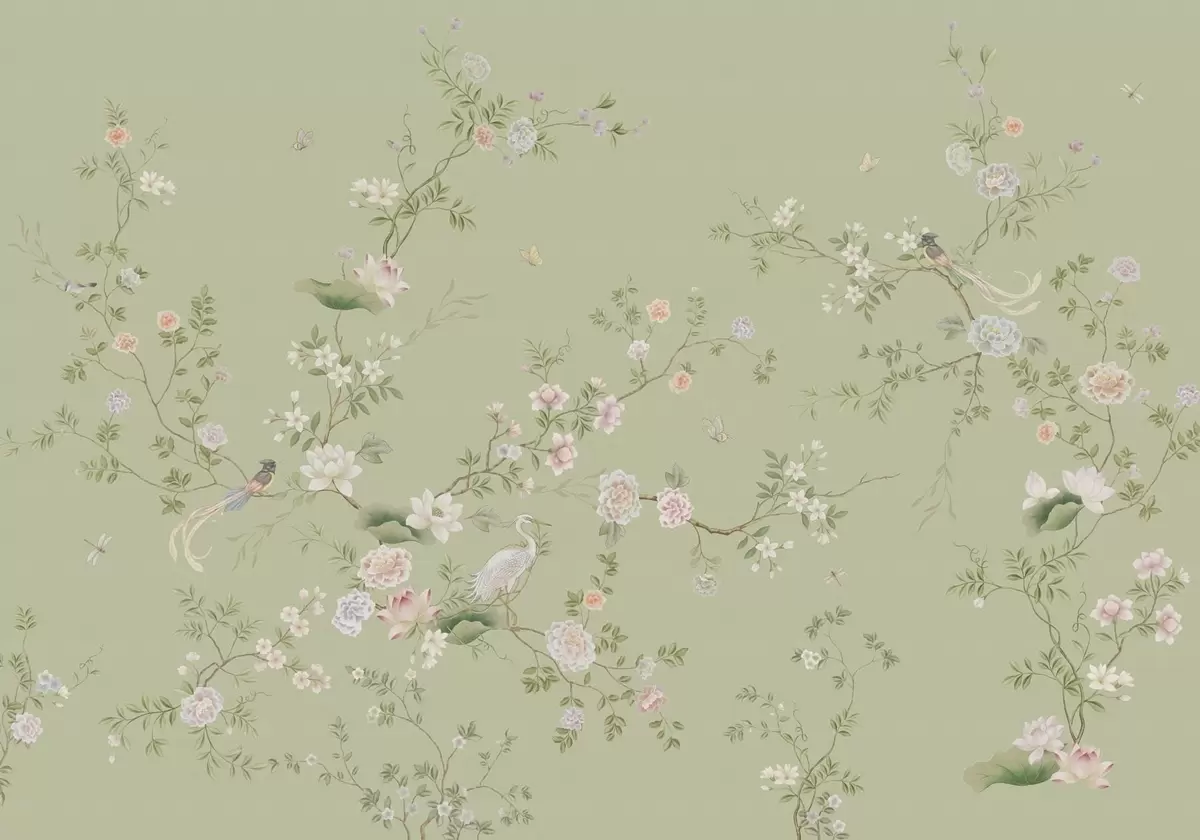Fototapeter Blomstrende grener med fugler på lysegrønn bakgrunn Nr. w05416