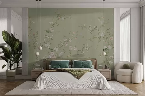 Fototapeter Blomstrende grener med fugler på lysegrønn bakgrunn Nr. w05416