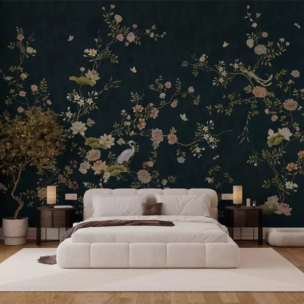 Fototapeter Blomstrende grener med fugler på mørk bakgrunn Nr. w05416v3