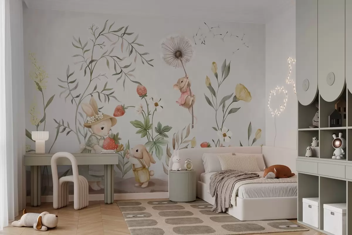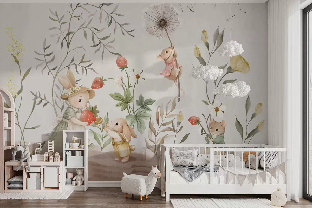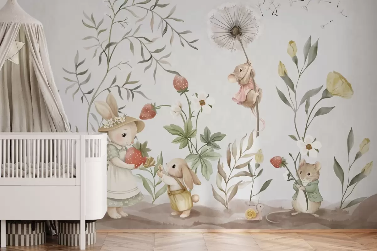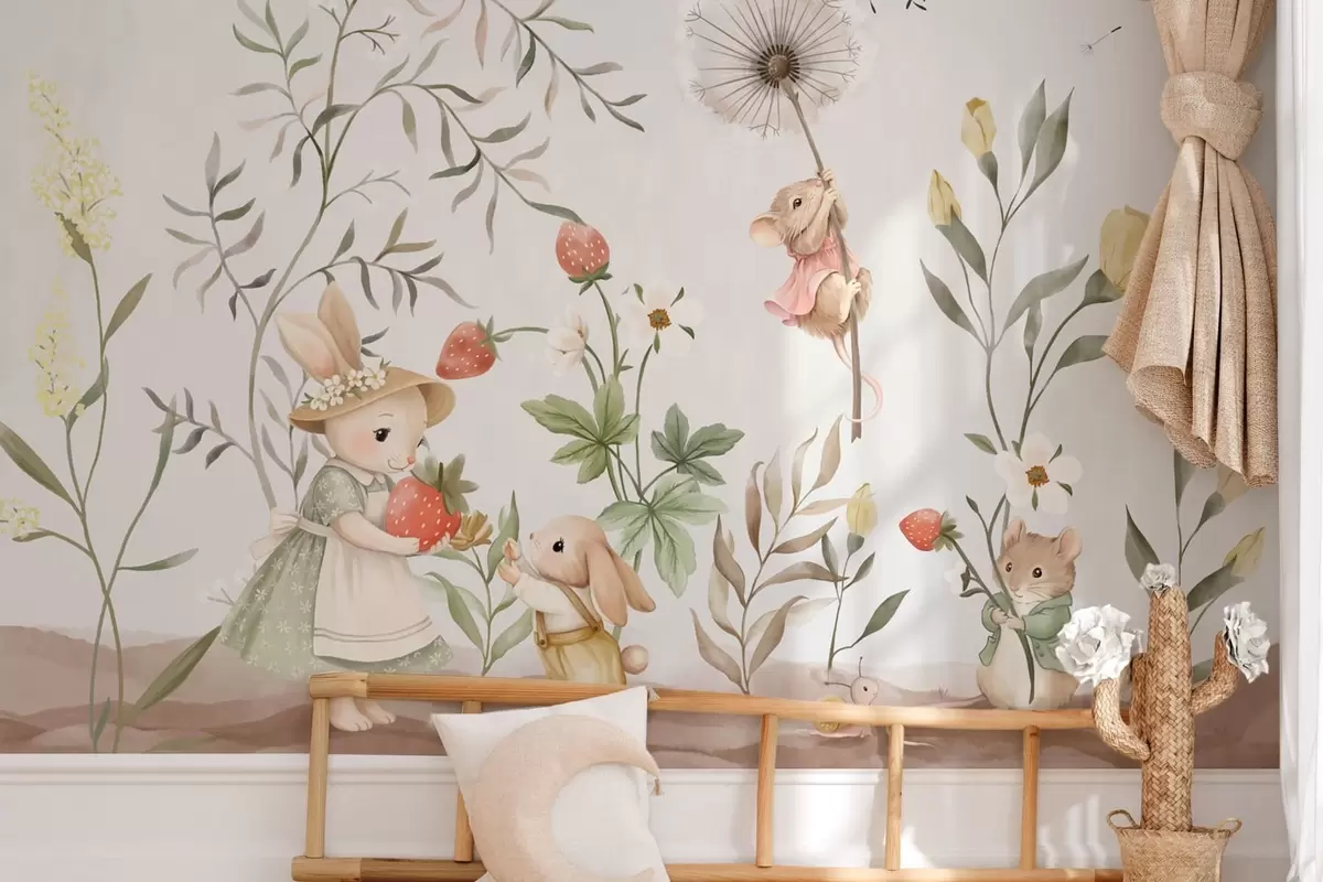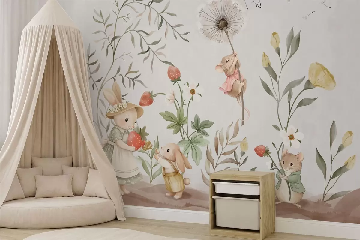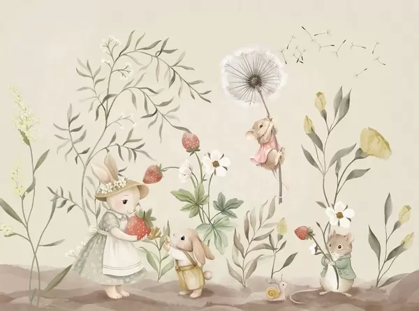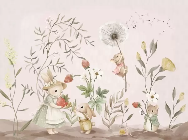 Fototapeter Barnillustrasjon av en kanin og en mus blant planter og blomster Nr. w05422