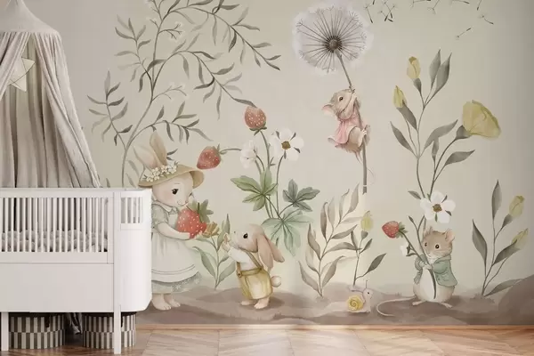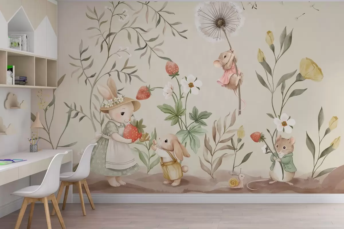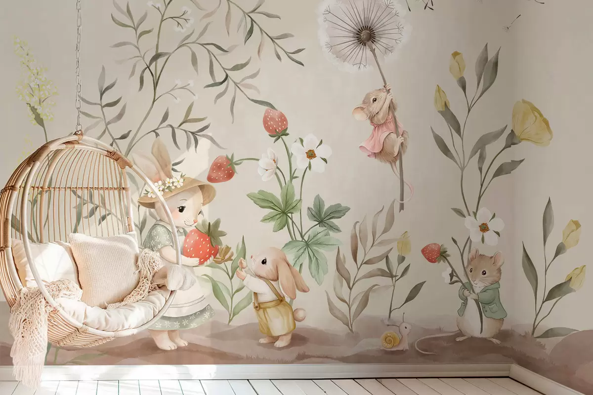 Fototapeter Illustrasjon av en kanin, en mus og planter med jordbær Nr. w05422v2