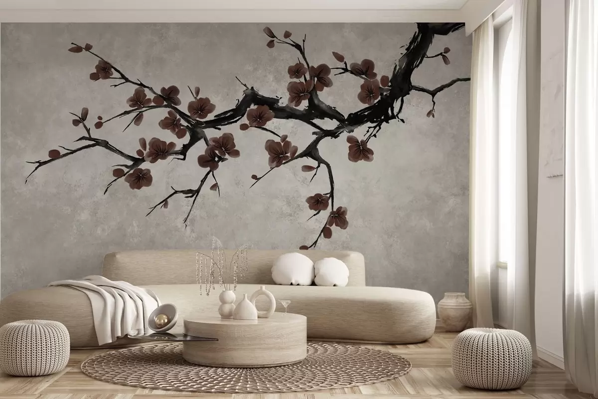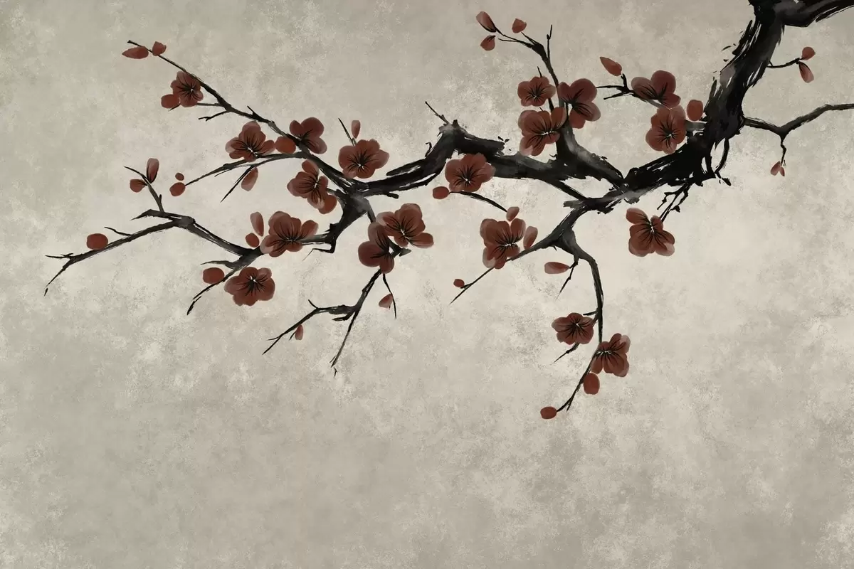Fototapeter En gren med mørkerøde blomster på en nøytral bakgrunn Nr. w05425v1