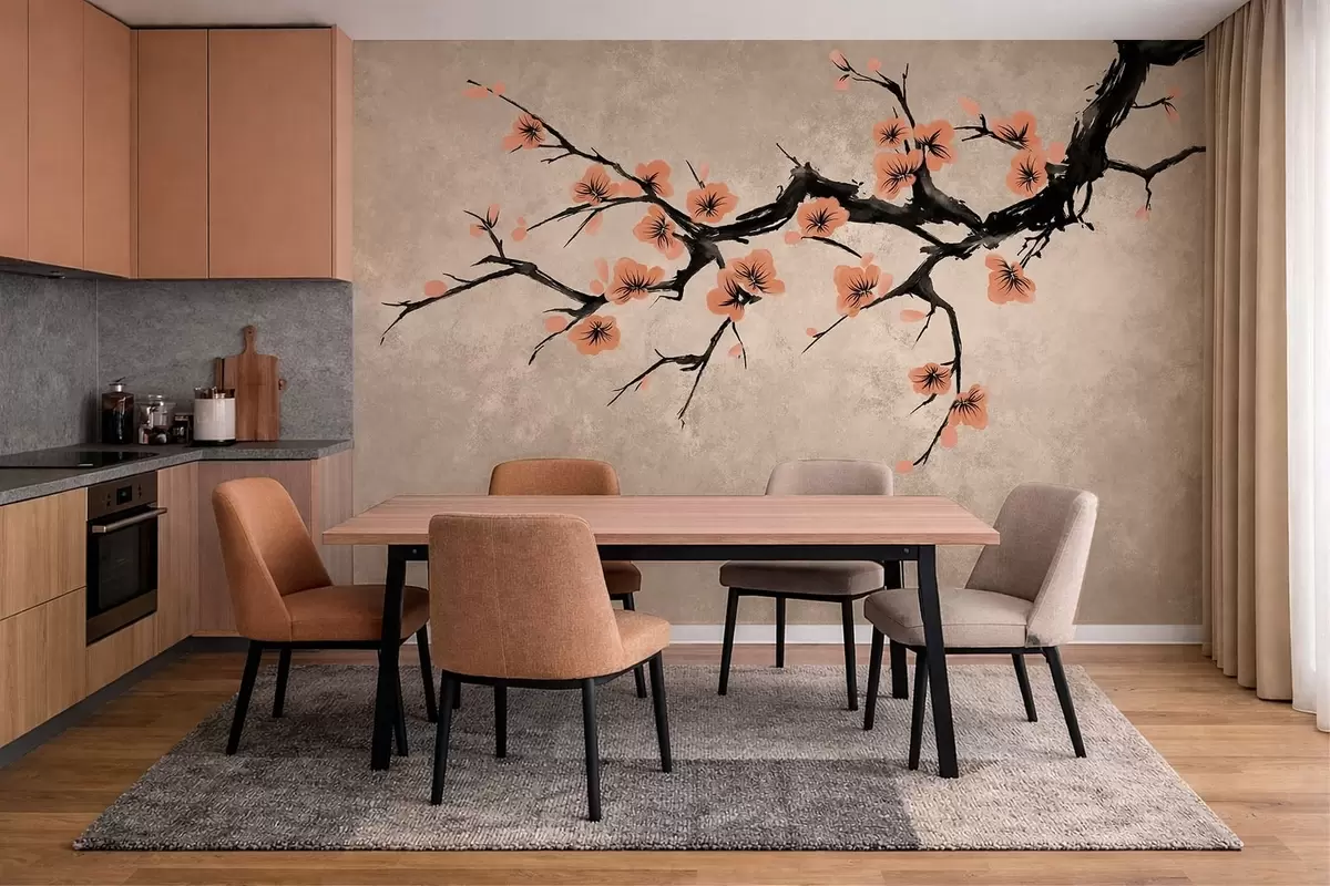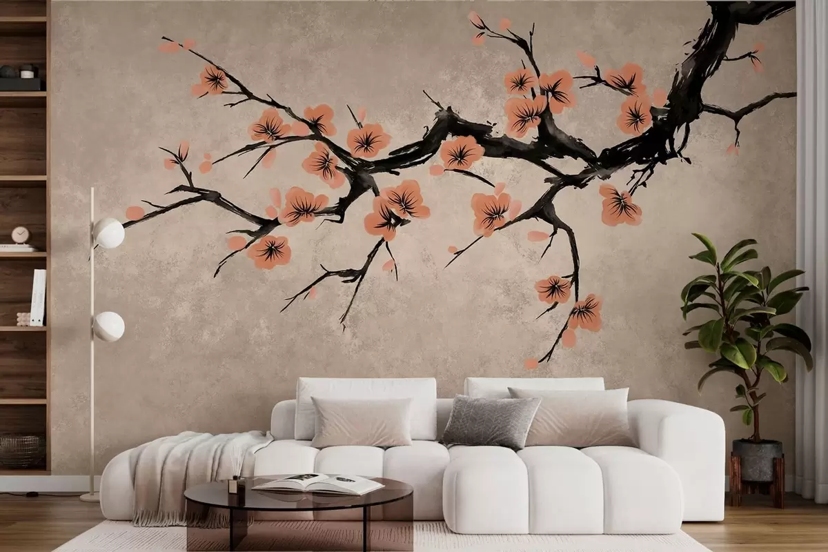 Fototapeter En gren med ferskenblomster på en strukturert bakgrunn Nr. w05425v3