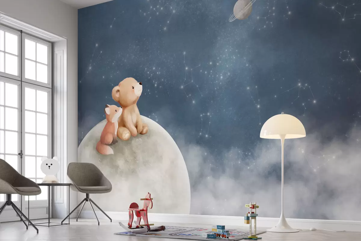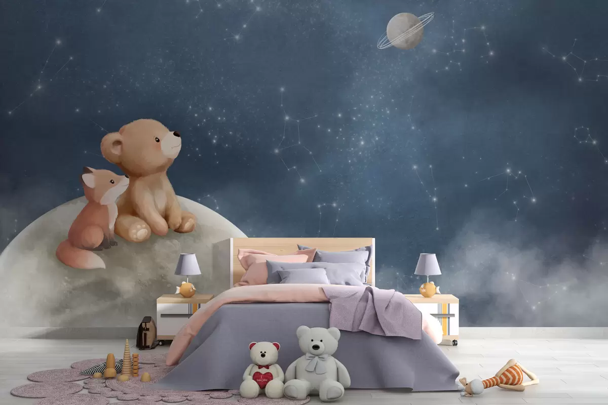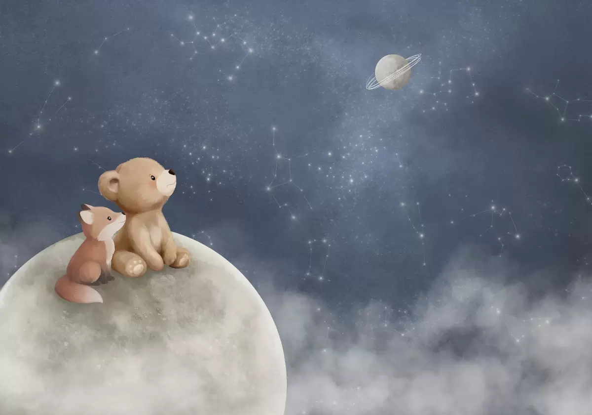 Fototapeter Pastellillustrasjon av bjørn og rev mot nattehimmelen Nr. w05431