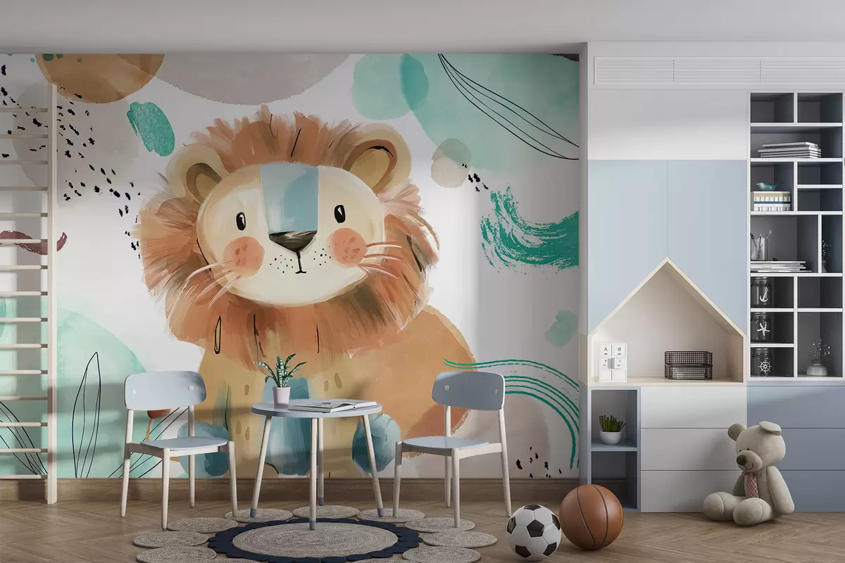 Fototapeter En søt tegneserieløve i en fargerik, abstrakt bakgrunn med penselstrøk og sprut av pastellfarger Nr. w07924