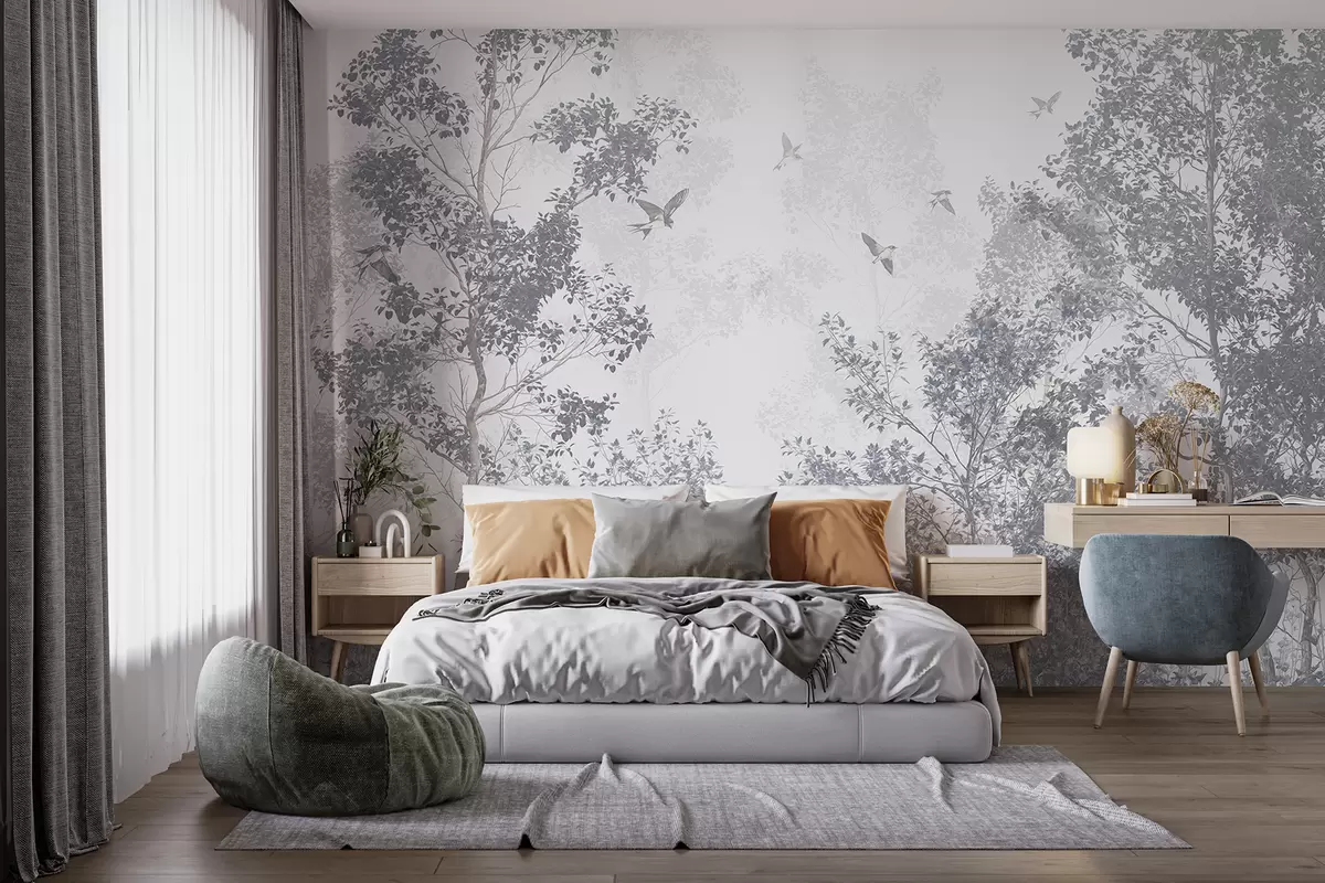 Fototapeter Trær med grå blader og grener med fugler som flyr på himmelen, hvit bakgrunn Nr. w07982v1