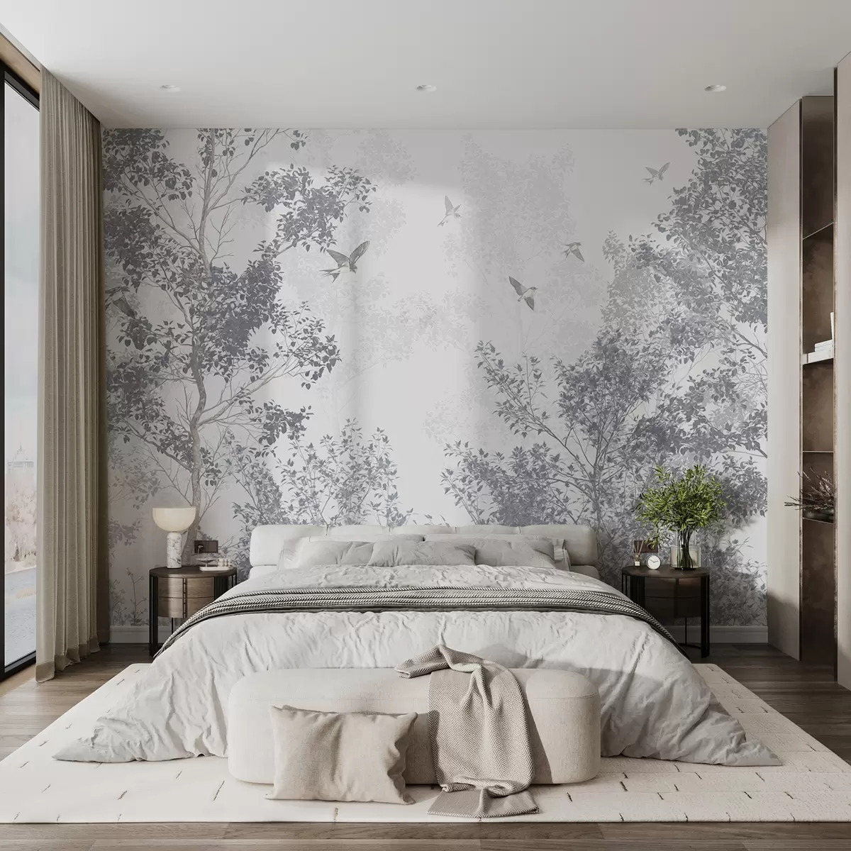 Fototapeter Trær med grå blader og grener med fugler som flyr på himmelen, hvit bakgrunn Nr. w07982v1