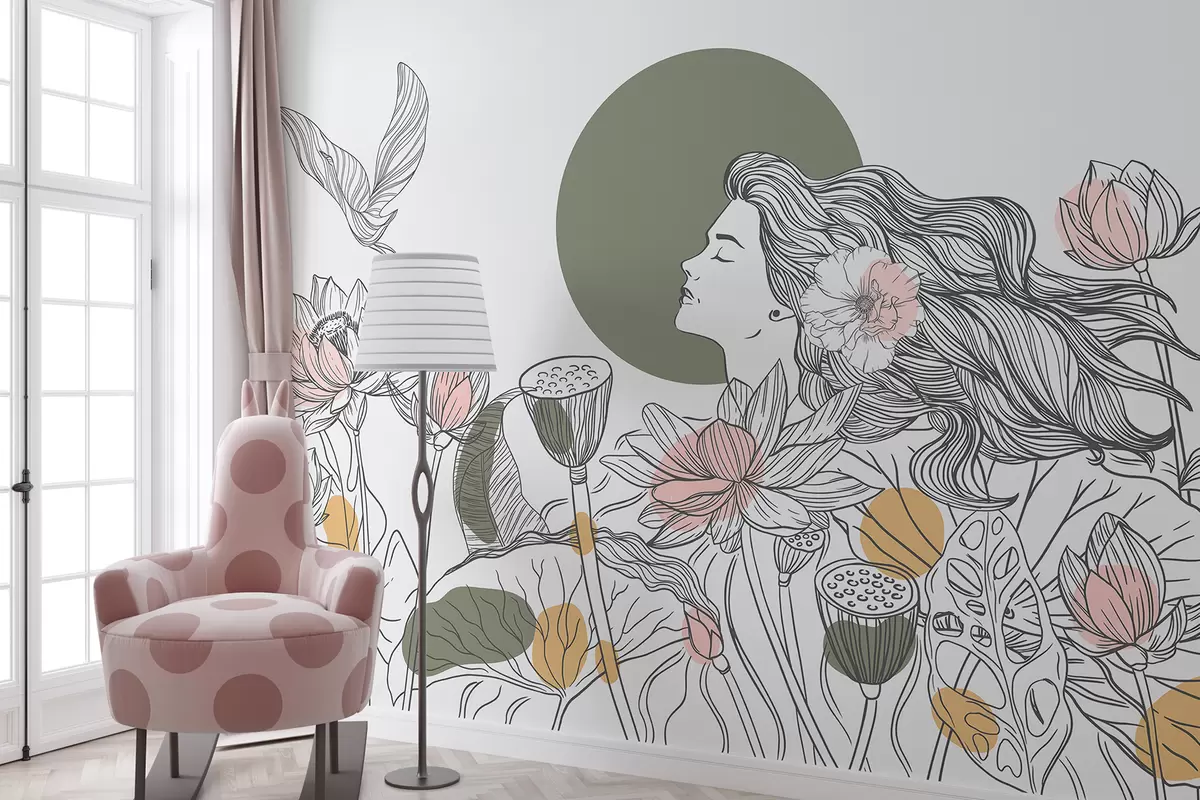 Fototapeter Kvinne i naturen, strektegning, lotusblomster, store blader, flygende fugler, pastellfarger Nr. w07988v6