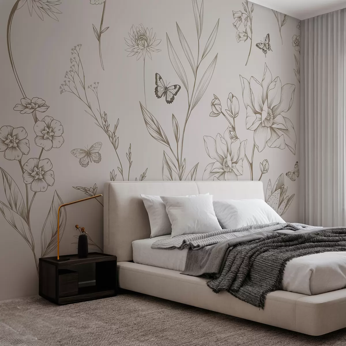 Fototapeter Boho Monokrome blomster og sommerfugler i beige farge Nr. w08088v1