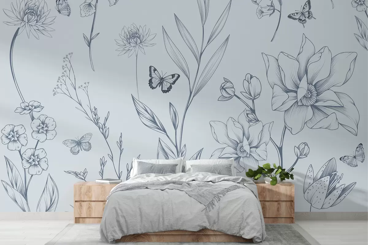 Fototapeter Boho monokrome blomster og sommerfugler i blått Nr. w08088v2
