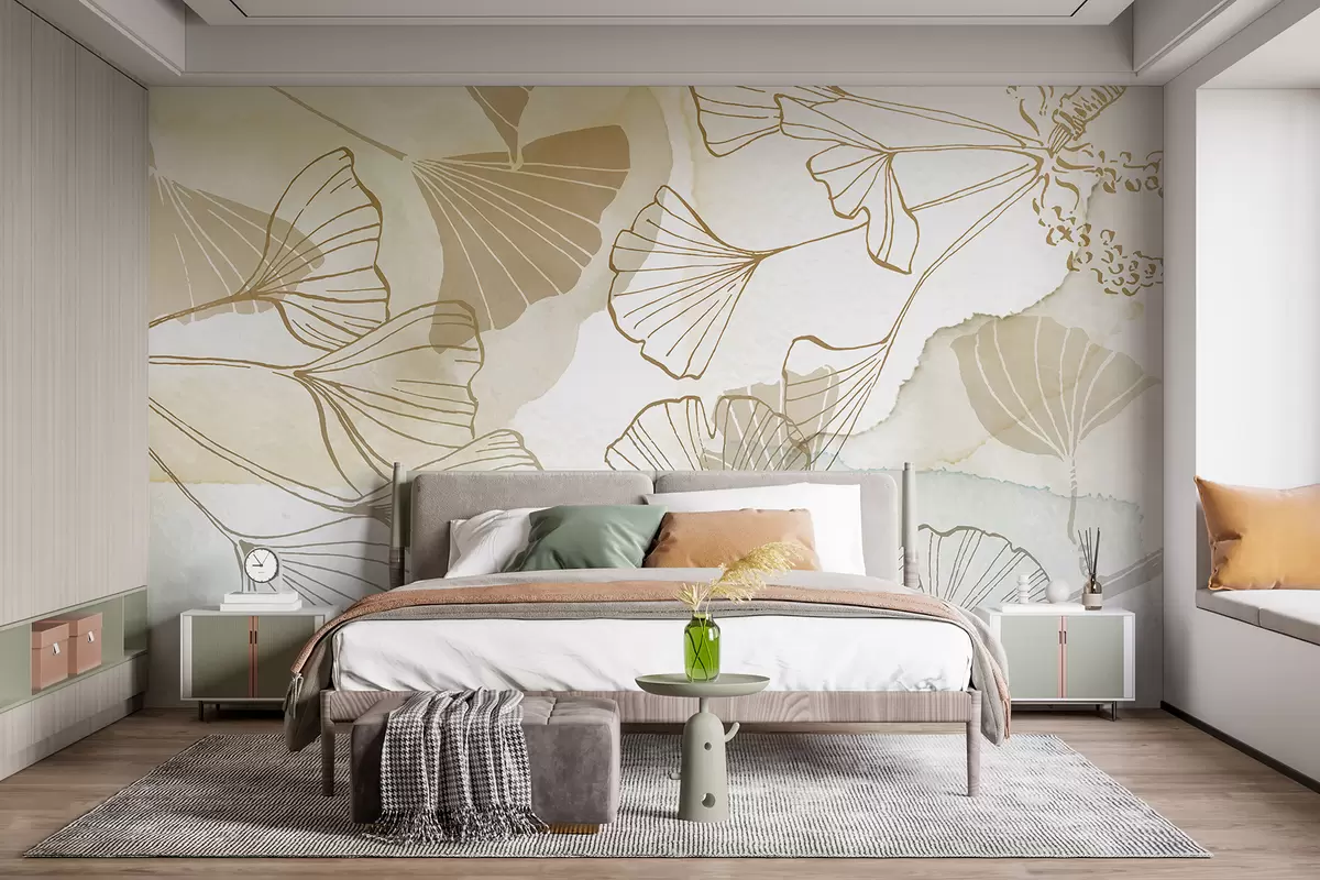 Fototapeter Et mønster av delikate ginkgoblader i nyanser av beige, brunfarge og blått mot en lys bakgrunn Nr. w08157