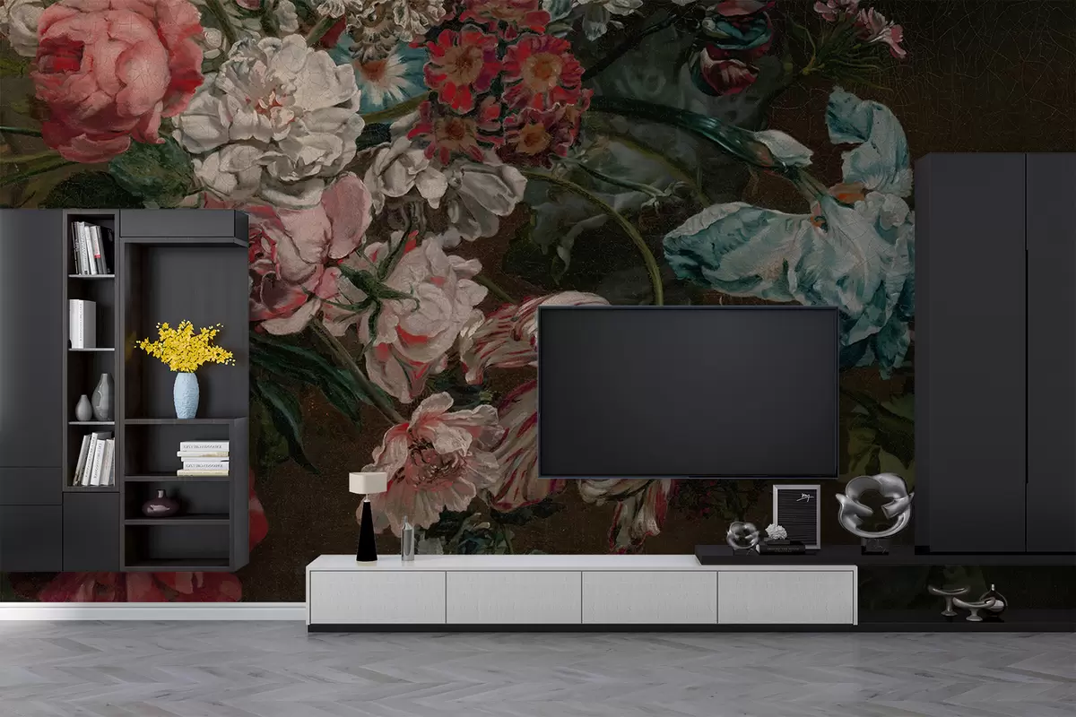 Fototapeter Vintage fargerike blomster inkludert rosa peoner, røde nelliker og hvite liljer mot en mørk bakgrunn Nr. w08163