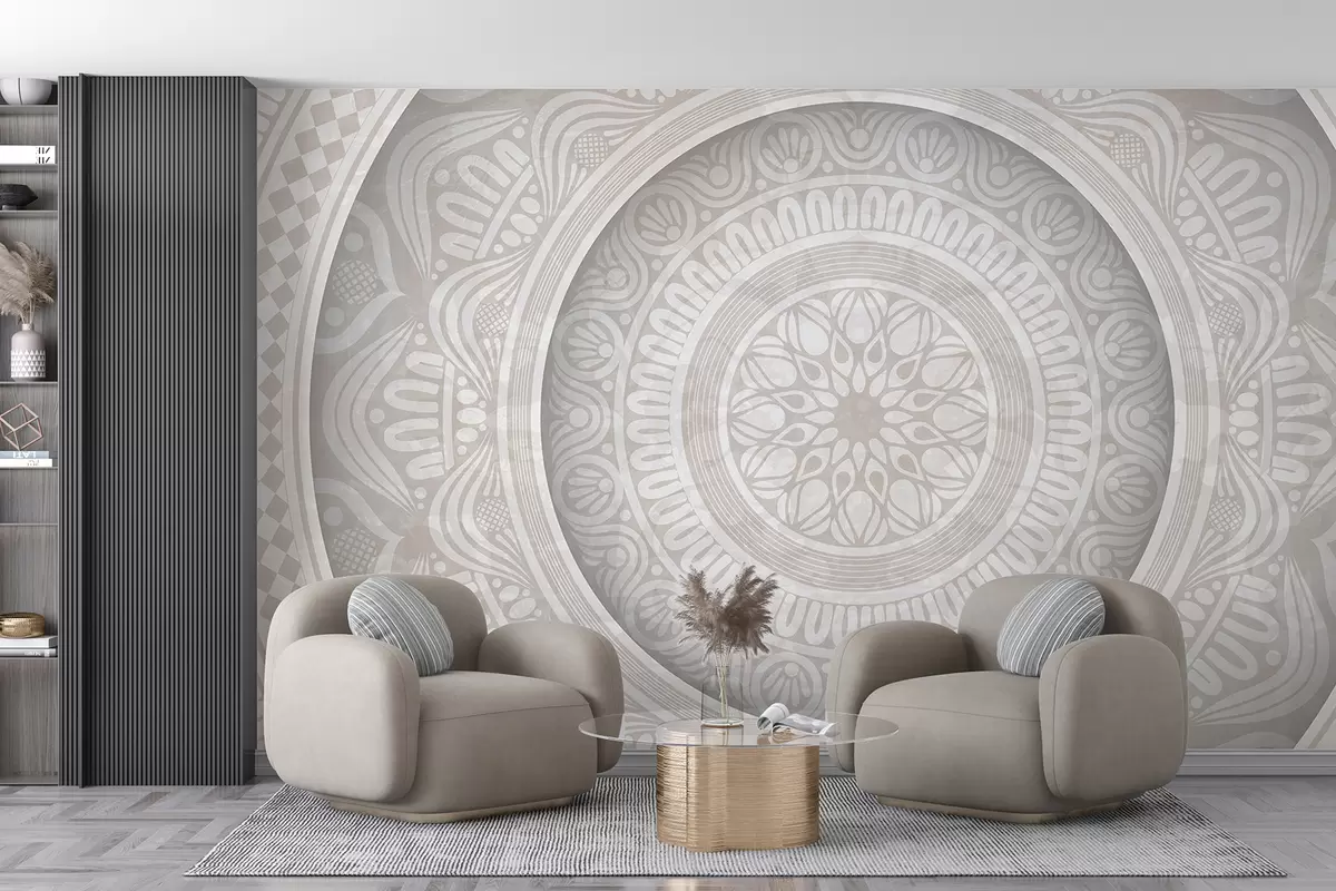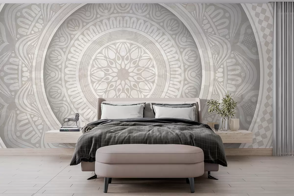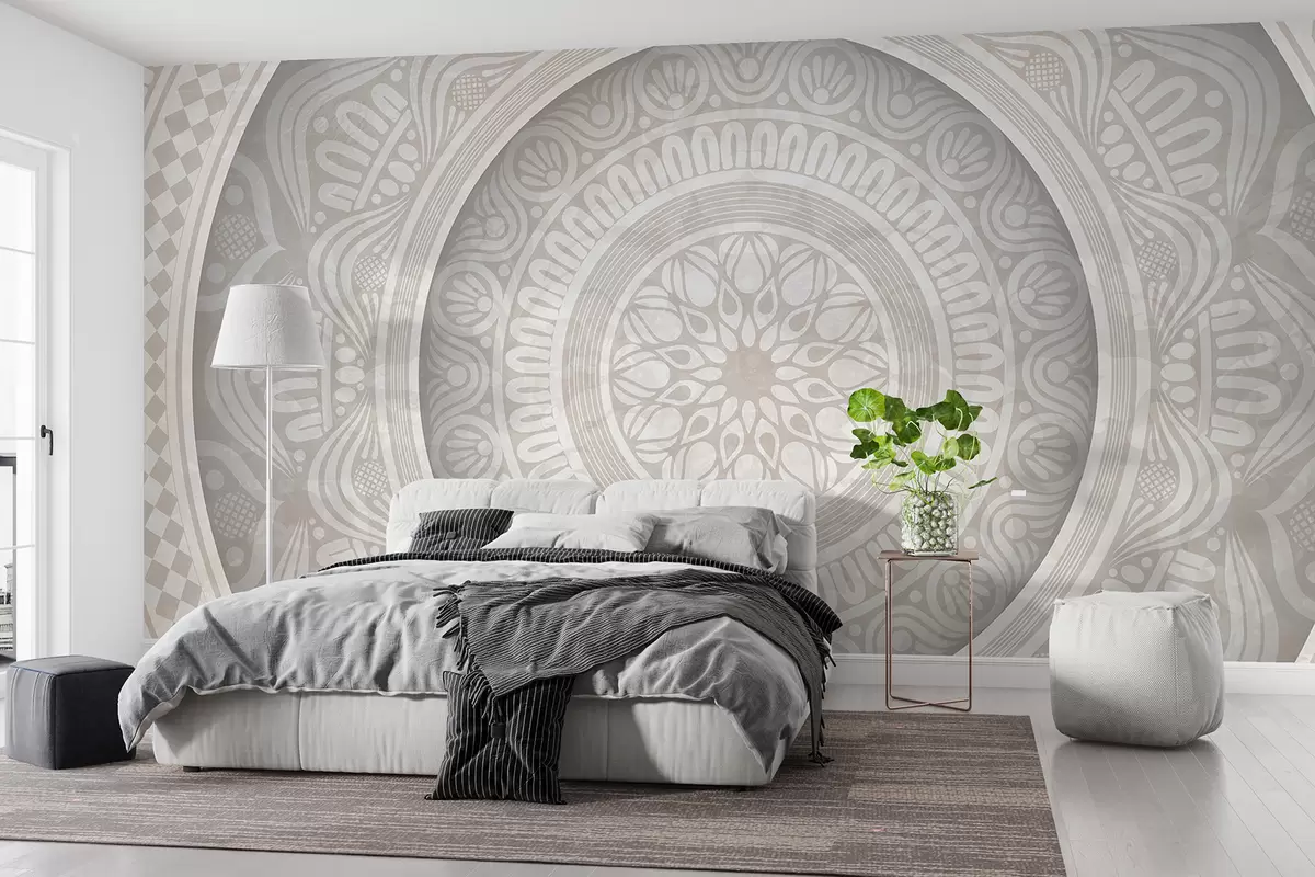Fototapeter Et detaljert symmetrisk grått og hvitt mandalatrykk med konsentriske sirkler og geometriske former Nr. w08182