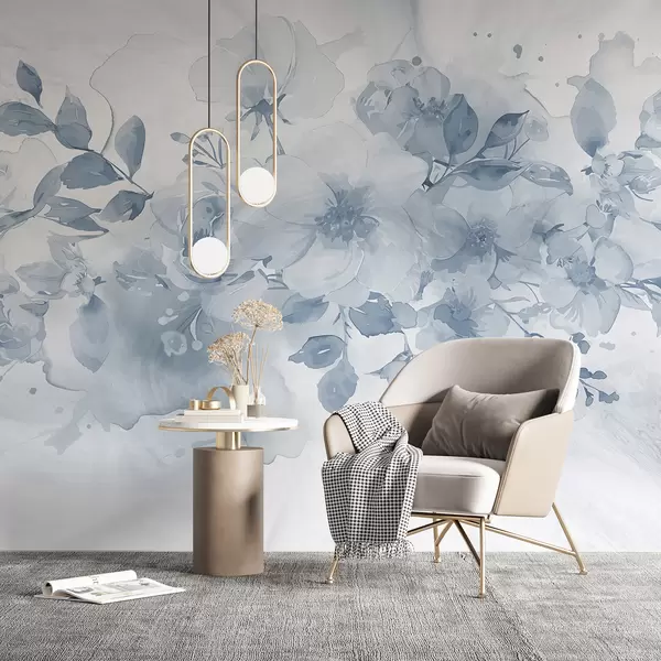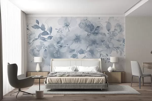 Fototapeter Mykt, uskarpt blomstermønster i nyanser av grått og hvitt, med delikate blomster og blader Nr. w08189