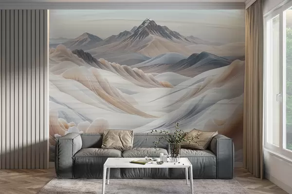 Fototapeter Fjellrikt landskapstrykk med snødekte topper i nyanser av beige minimalistisk estetikk Nr. w08191
