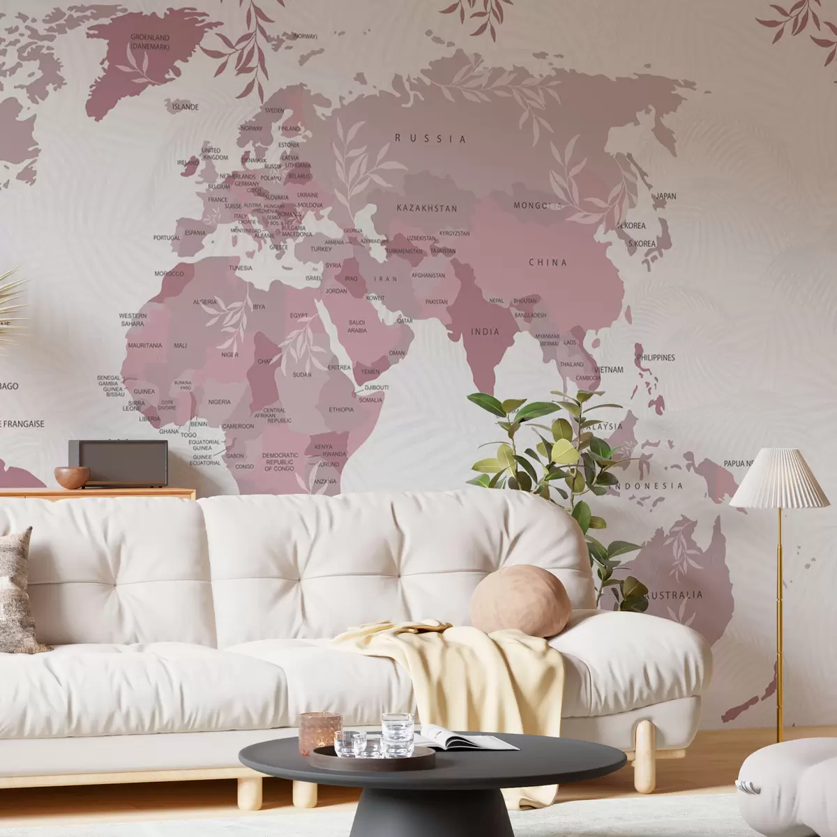 Fototapeter Stilig verdenskart med blader og planter rosa farge Nr. w08211v3