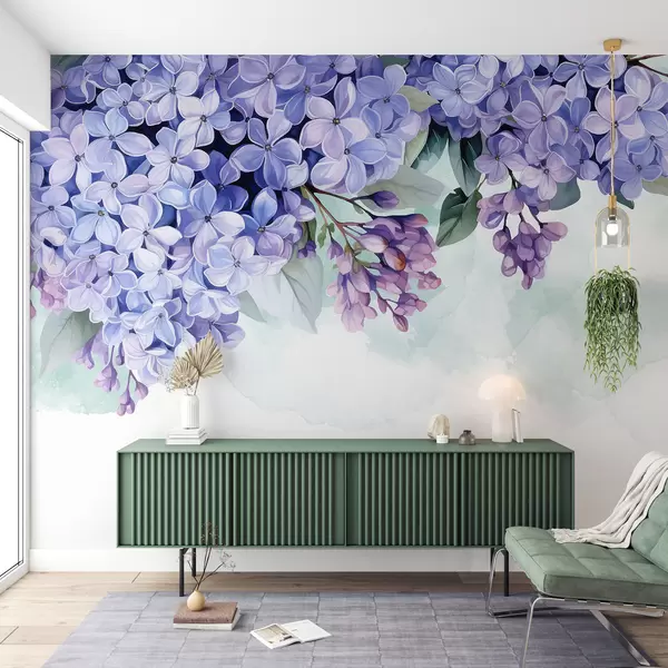 Fototapeter Levende lilla hortensiablomster med grønne blader som fyller rammen mot en myk, uskarp bakgrunn Nr. w08223