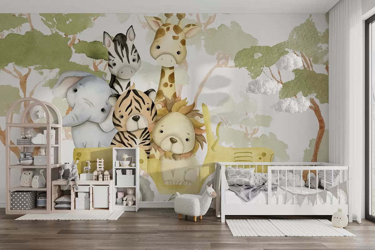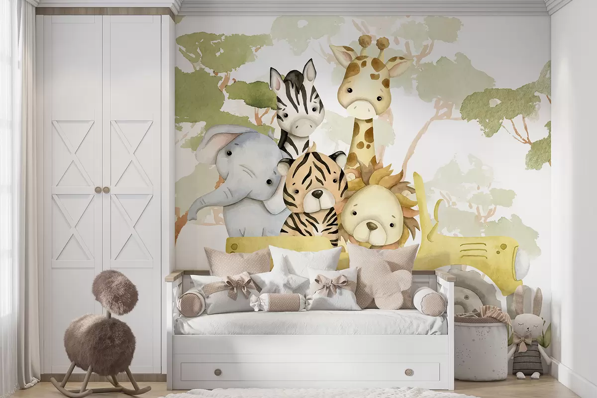 Fototapeter En gul lekebil som frakter en sjiraff, en tiger, en kanin og en elefant, mot en bakgrunn av grønt løvverk Nr. w08233