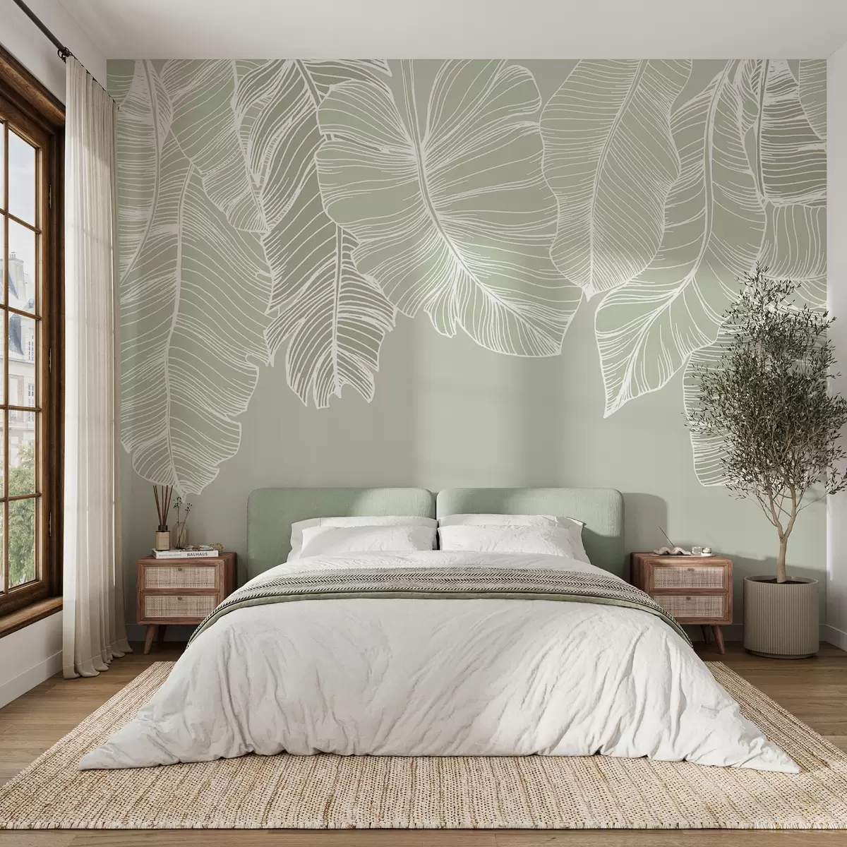 Fototapeter Hvite tropiske blomsterblader med lysegrønn bakgrunn, minimalistisk linjekunstdesign Nr. w08235v1