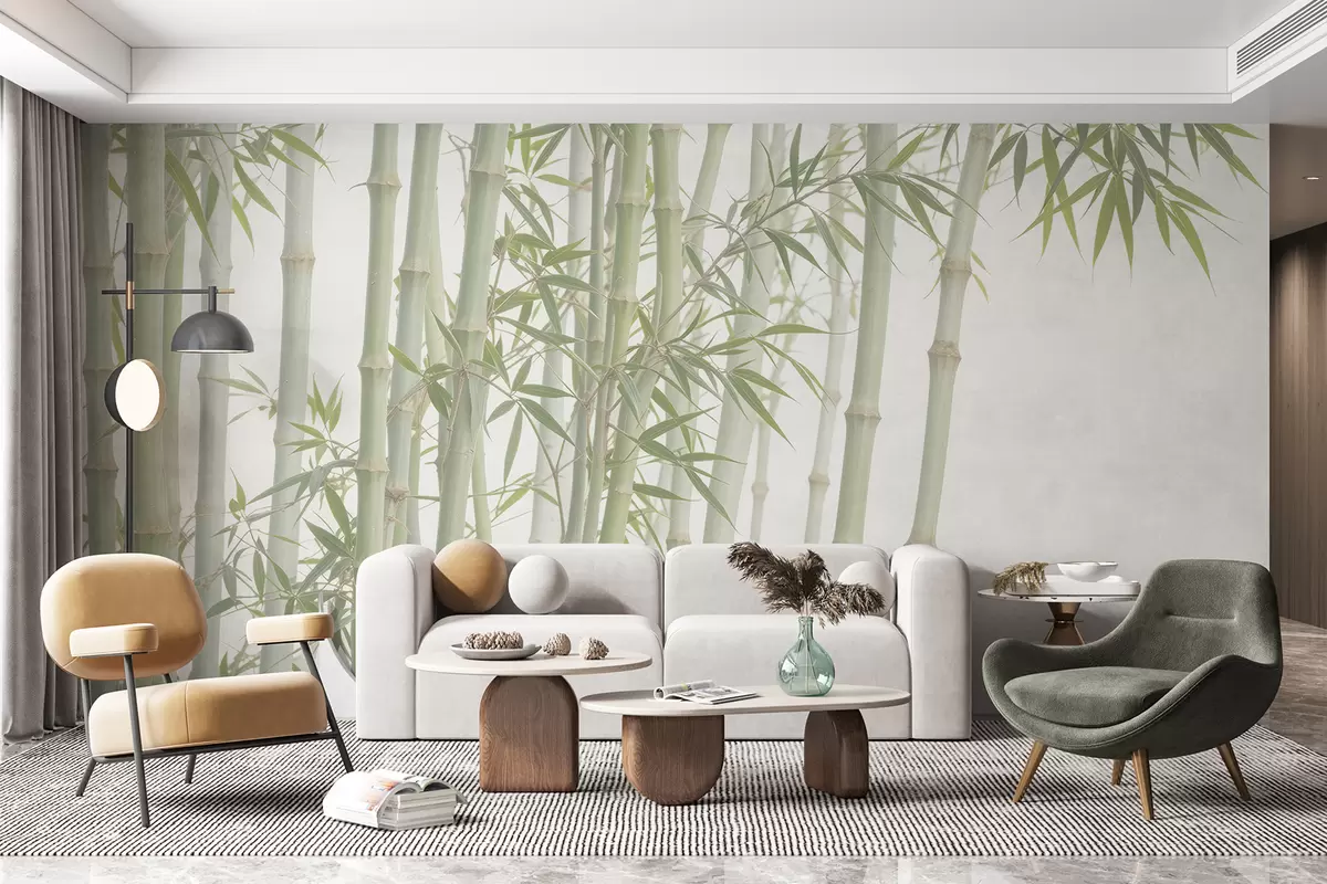 Fototapeter En tett bambusskog med høye bambusstilker og grønne blader mot en myk, disig bakgrunn Nr. w08237