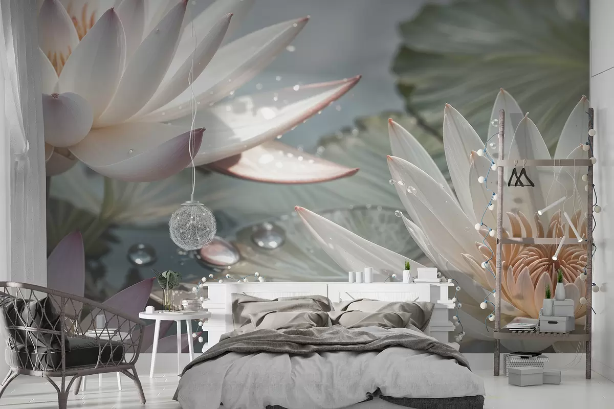 Fototapeter Et nærbilde av hvite lotusblomster med vanndråper på kronbladene mot en uskarp grønn bakgrunn Nr. w08252